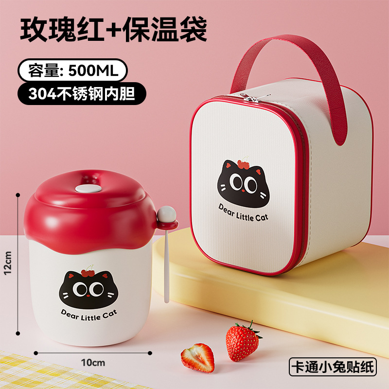 red [with black cat stickers + spoon] + bag