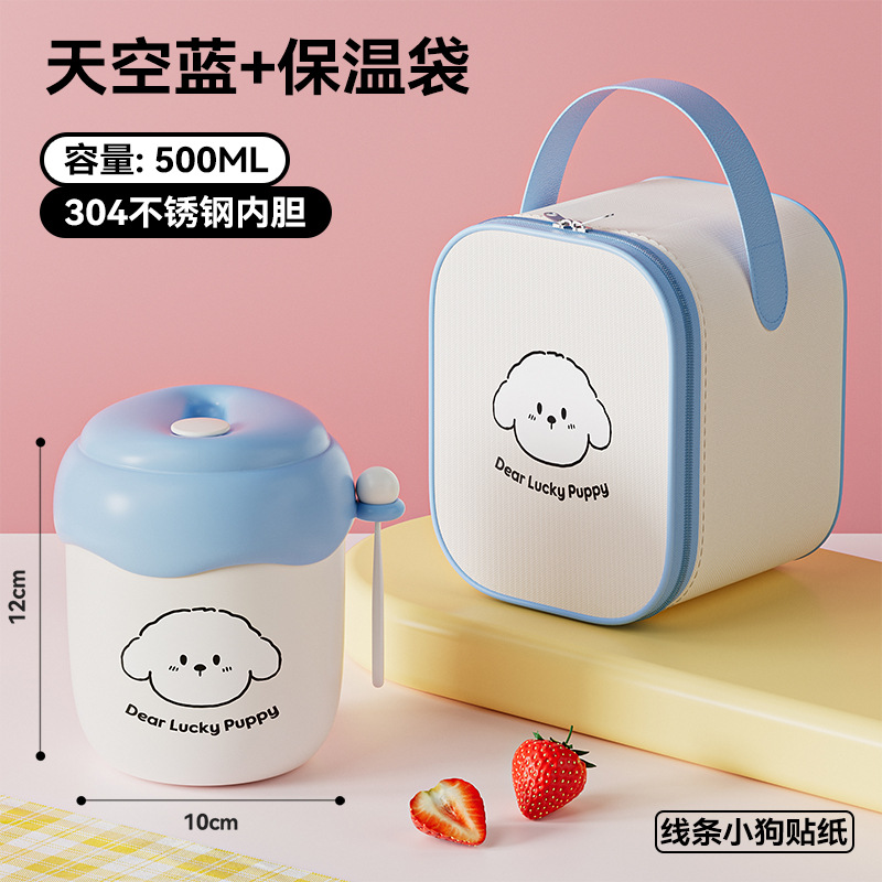 blue [with puppy stickers + spoon] + bag