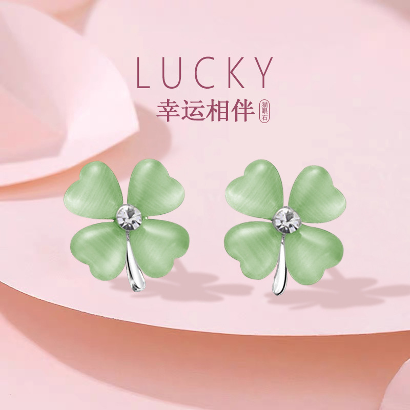 silver needle: green cat's eye four leaf clover ear stud