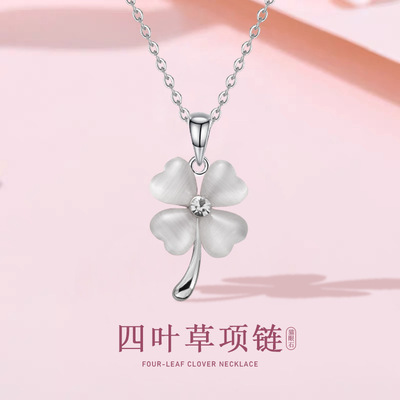 titanium steel necklace: white cat eye clover necklace
