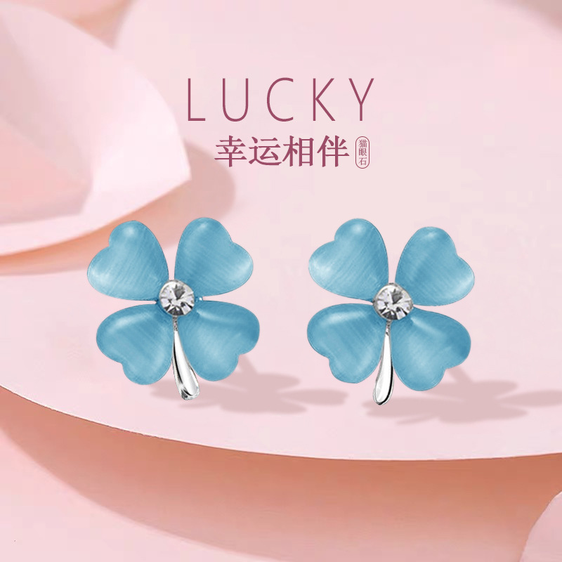 silver needle: blue cat's eye four leaf clover ear stud