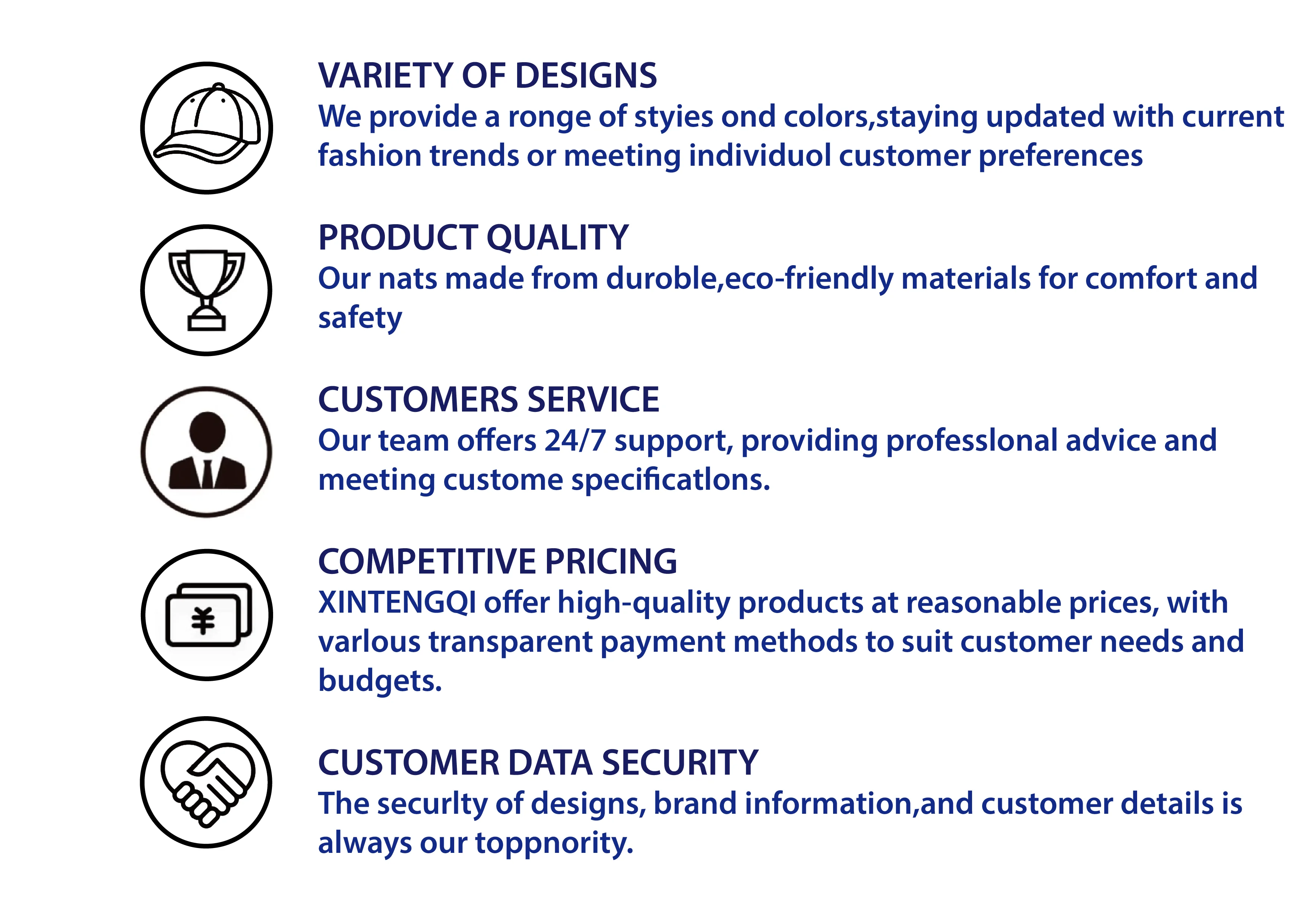 Hebei Xintengqi Technology Co., Ltd. is an enterprise specializing in the research and development, sales and service of hats such as baseball caps, trucker hats, bucket hats, flat-brim hats, etc. The company is located in Jinzhou City, Shijiazhuang City, adjacent to Tianjin Port, with convenient transportation and beautiful environment. As a professional hat supplier, we have been committed to selling hats that combine fashion, functionality, comfort, durability and performance. Whether you are a professional athlete, a sports enthusiast, or just looking for fashion accessories, as a company operator, we have experienced staff dedicated to strict quality control and thoughtful customer service, always ready to discuss customer needs to ensure customer satisfaction. In addition, our products are not only sold to major provinces and cities across the country, but also exported to various countries and regions, including the United States, Canada, Australia, the United Kingdom and many other countries or regions. We also accept OEM and ODM orders for long-term cooperation. Continuously improving management and quality standards, from classic design to modern innovation, we always have one for everyone. Due to our professional service, high-quality products and competitive prices, we enjoy a reliable reputation among customers. If you have any new ideas or suggestions for our products, please feel free to contact us. We warmly welcome customers at home and abroad to cooperate with us and achieve common success.