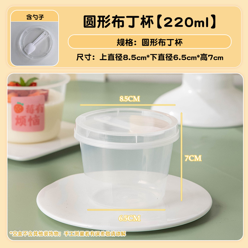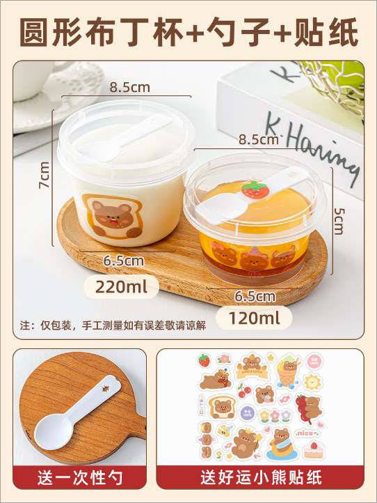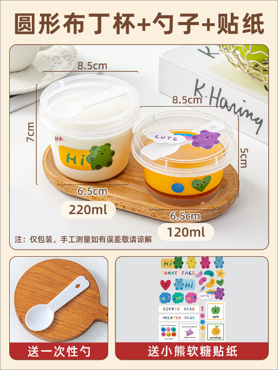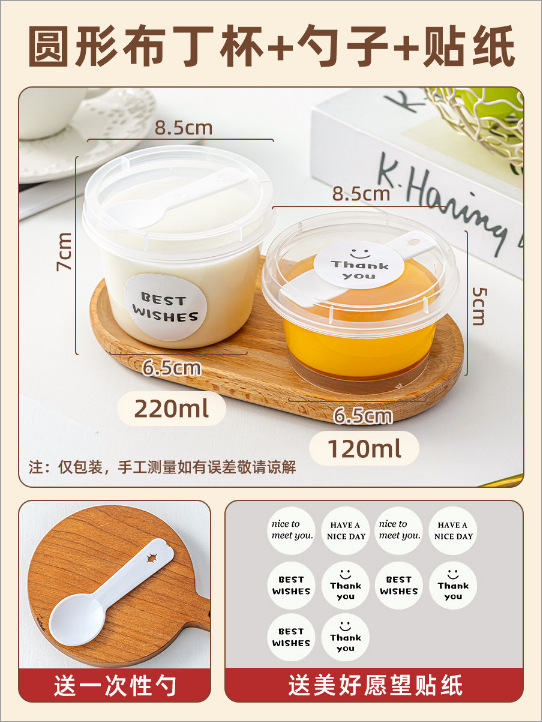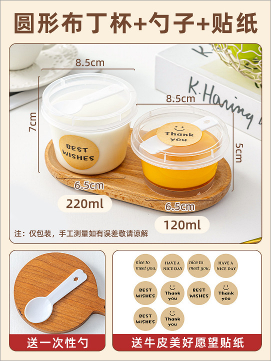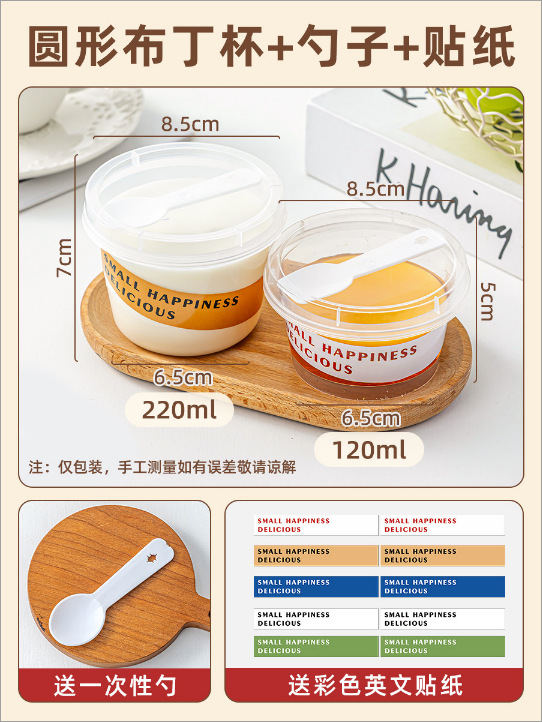 [round 220ml] pudding cup with spoon +10 pieces of kraft paper good wish stickers
