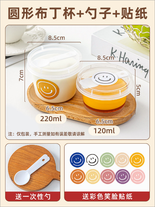 round pudding cup [120ml] 10 pcs with spoon + [colorful smiley face] sticker 1 pc