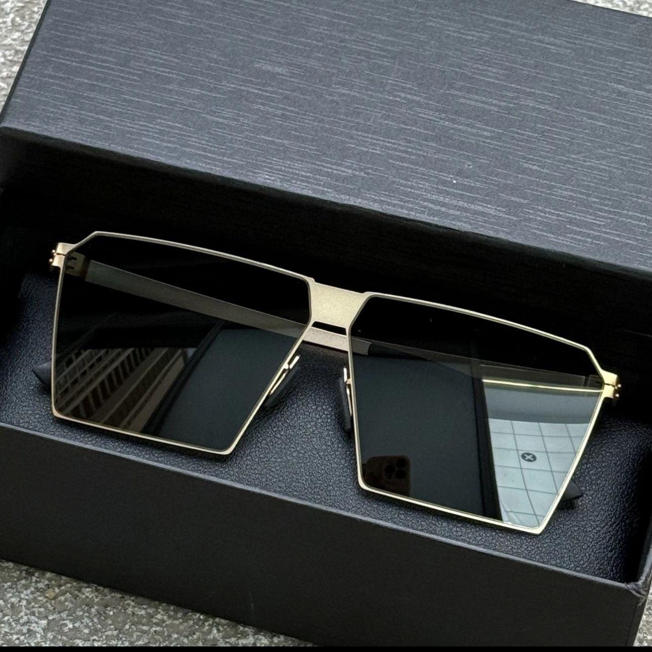 gold frame black and grey lens