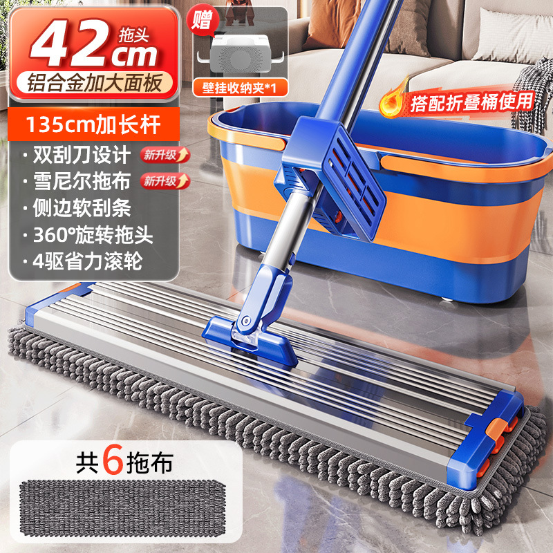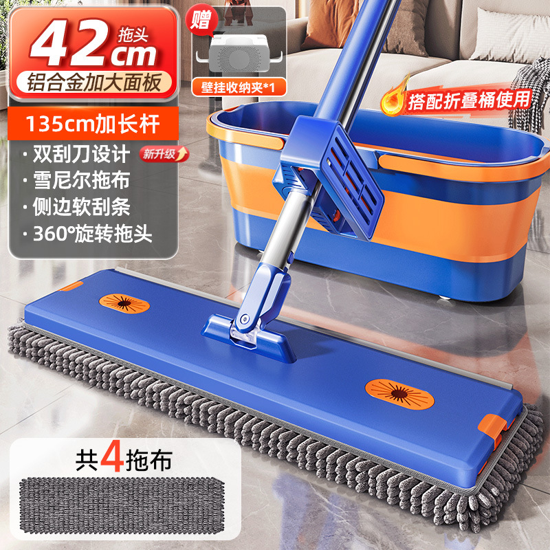 42cm thick aluminum panel [6 pieces in total newly upgraded chenille mop] blue orange + mop rack + collapsible bucket