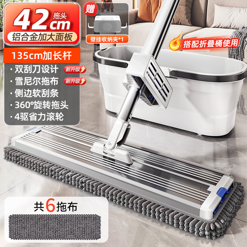 42cm thick aluminum panel [6 pieces in total newly upgraded chenille mop] white and blue + mop rack + collapsible bucket