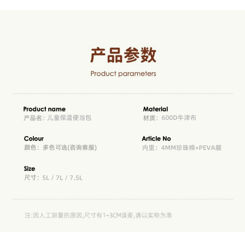 Material: 600D Oxford cloth + 4mm pearl cotton + PEVA film