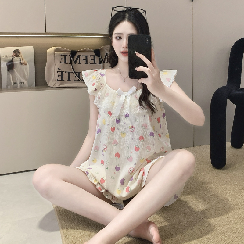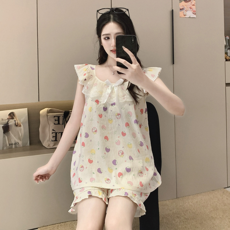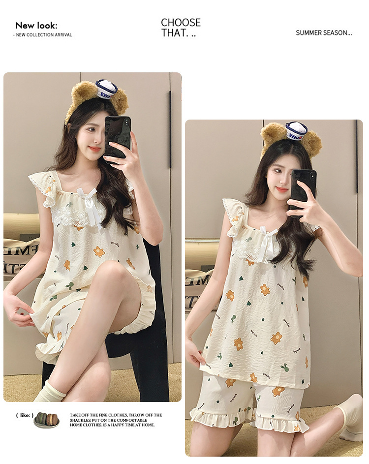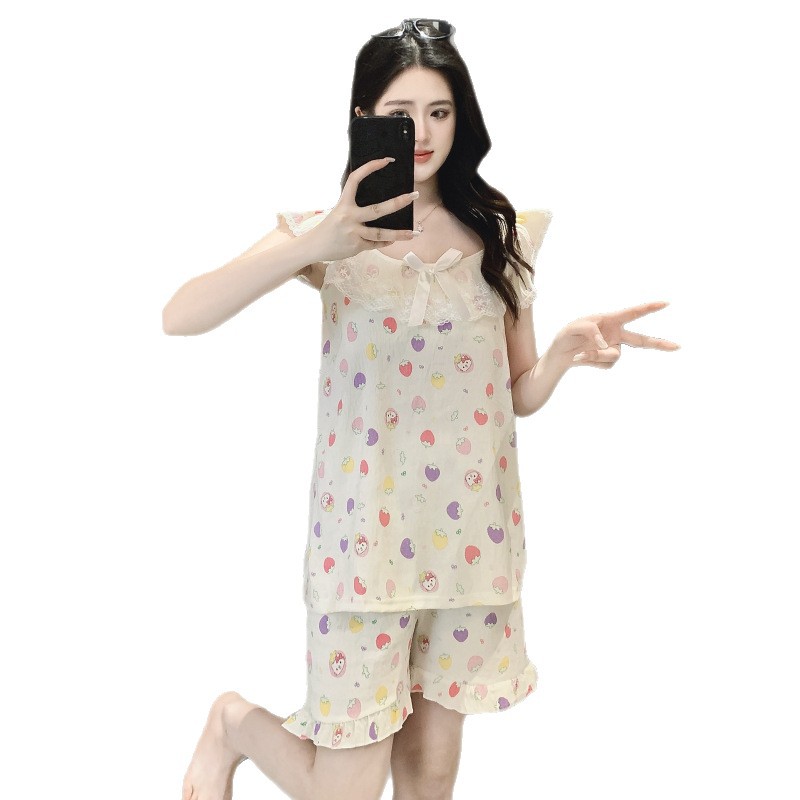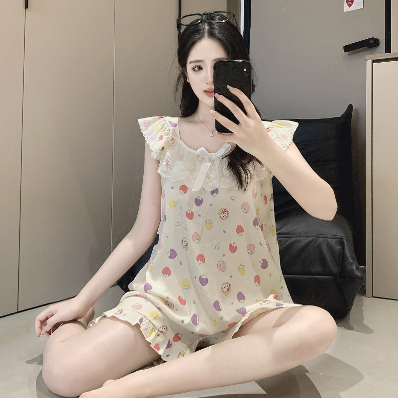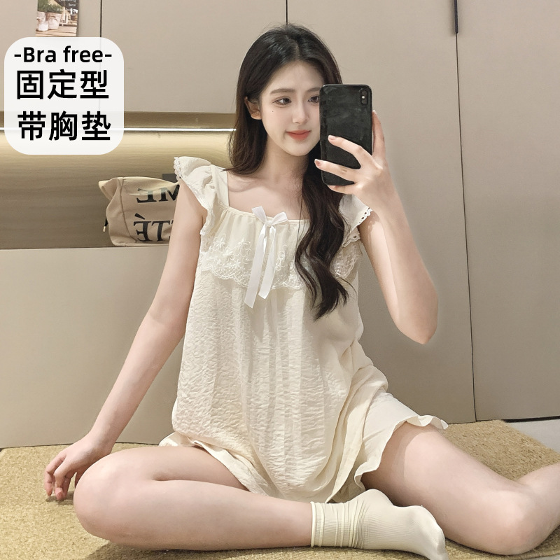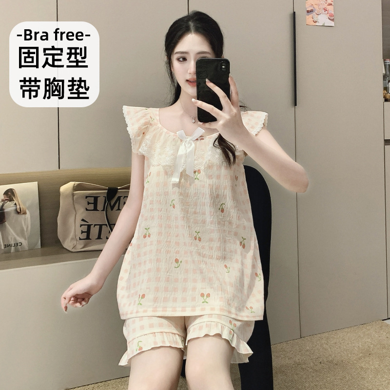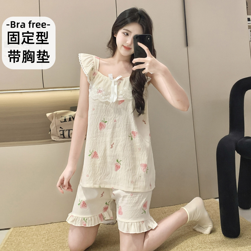 2026 summer new cloud cotton pajamas women's cute sweet lace girl sleeveless homewear suit with chest pad