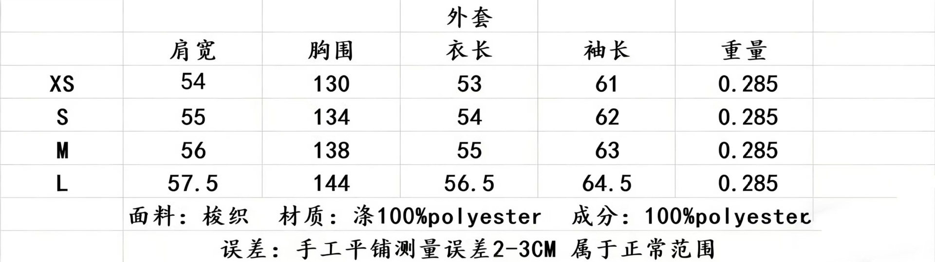 | extra small | CN¥ 62.0 |