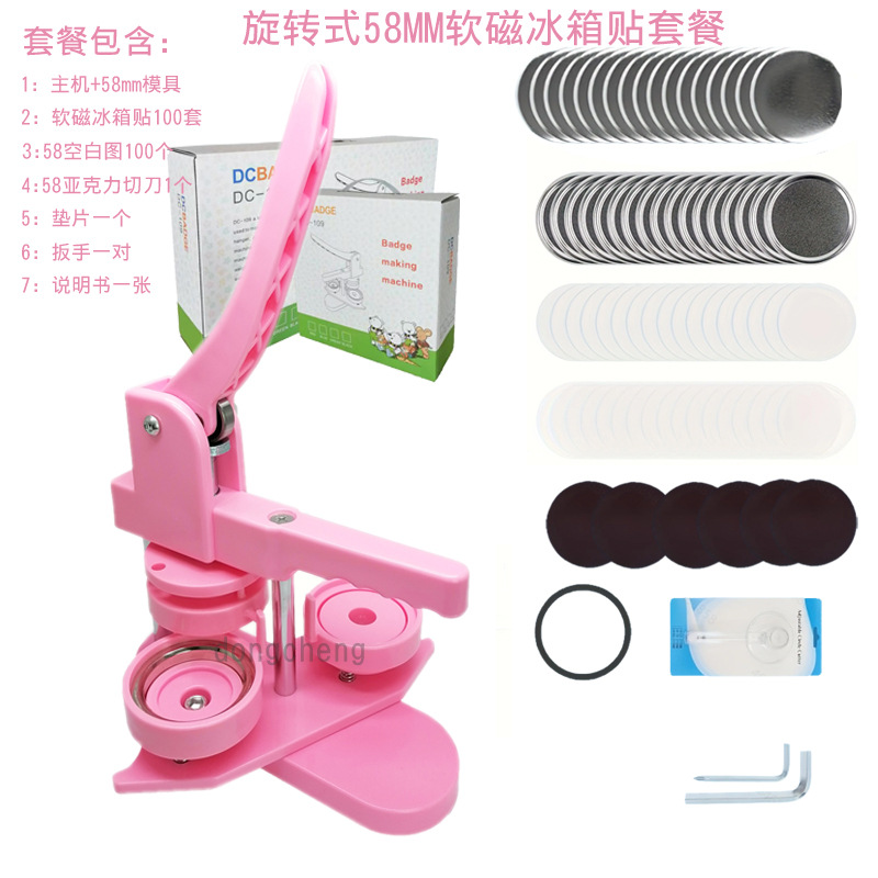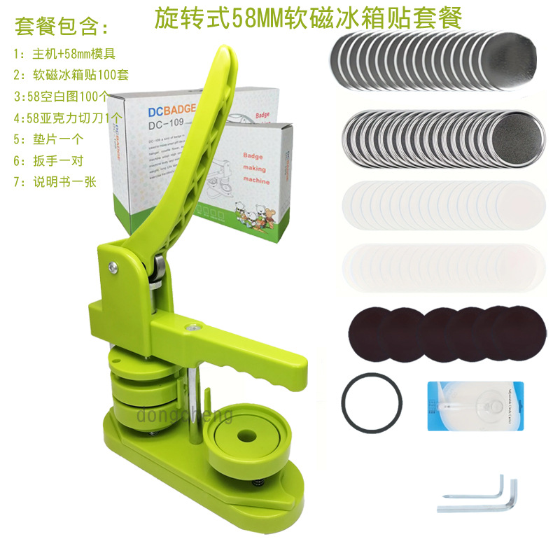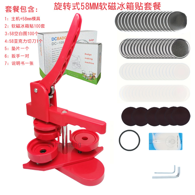 The set includes: Chest Badge Machine + 58mm mold, 58mm soft magnet refrigerator magnets 100 sets, blank designs 100 pieces, and one acrylic cutting knife.
