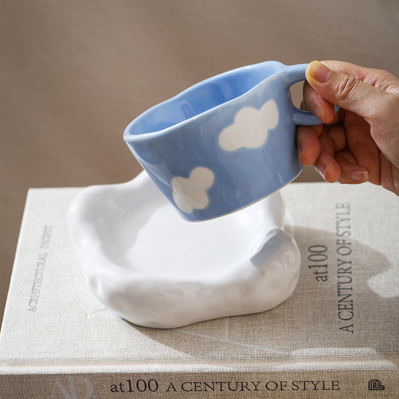 ceramic cup dish hand-painted blue sky and white clouds ceramic cup underglaze color mark cup cute water glass oat cup milk cup