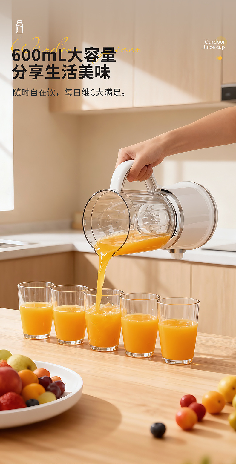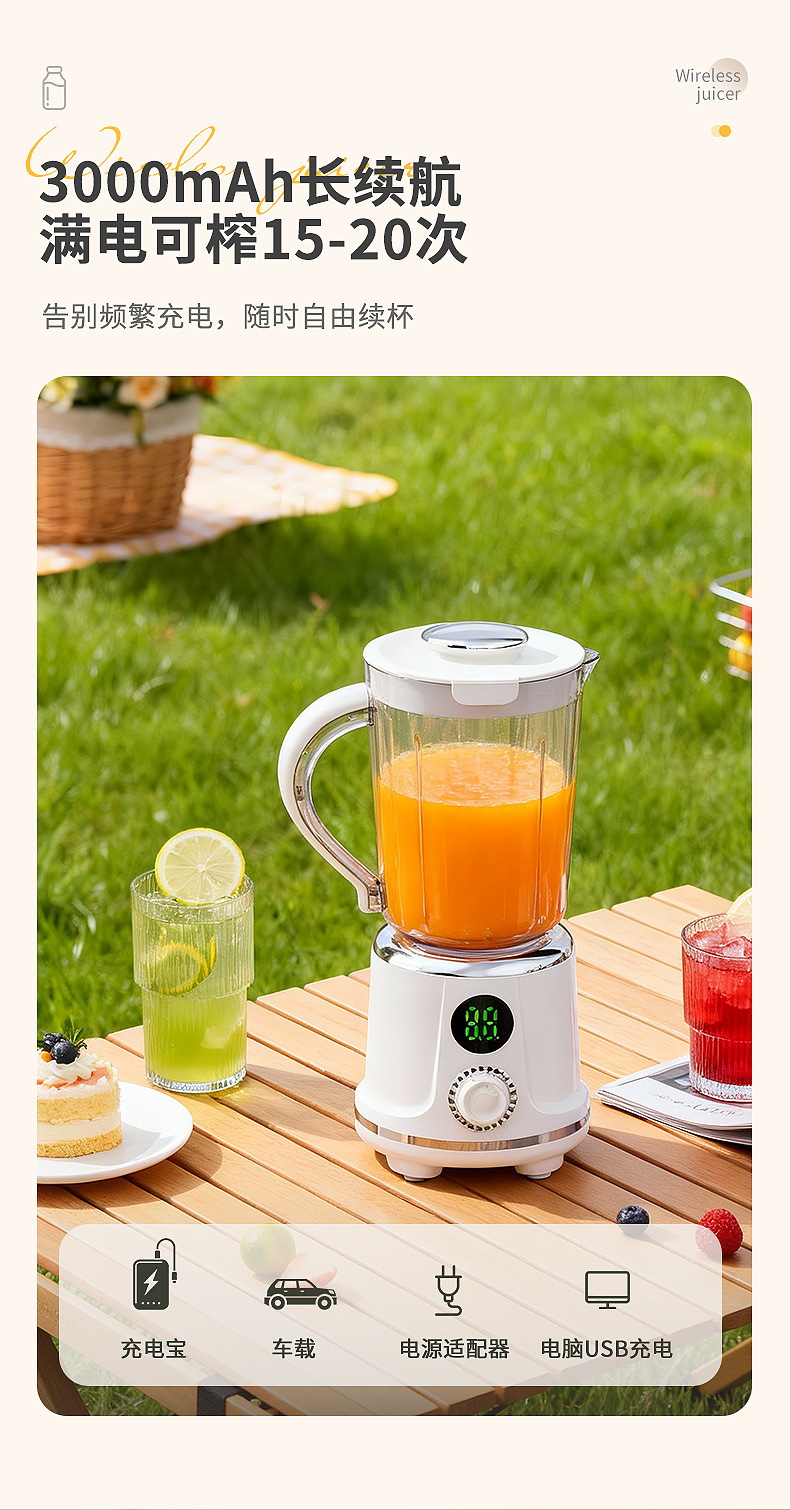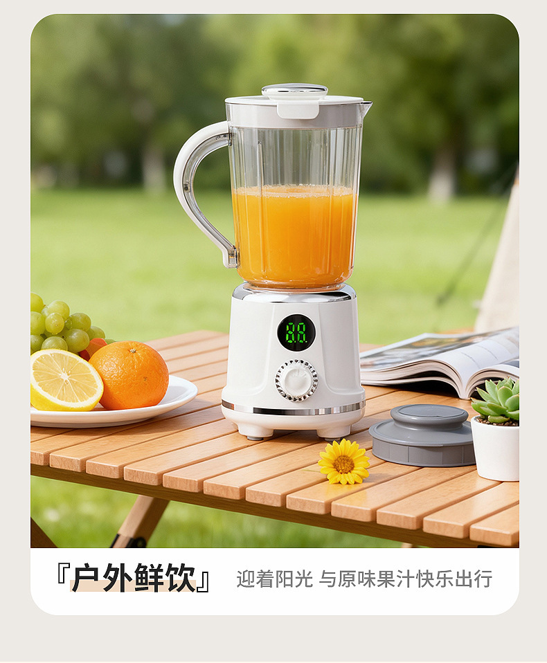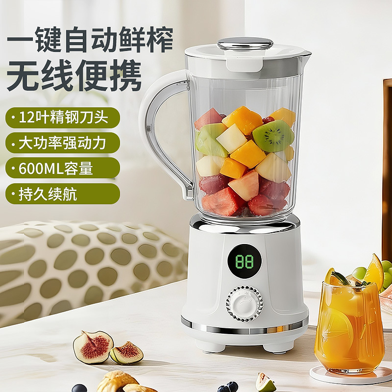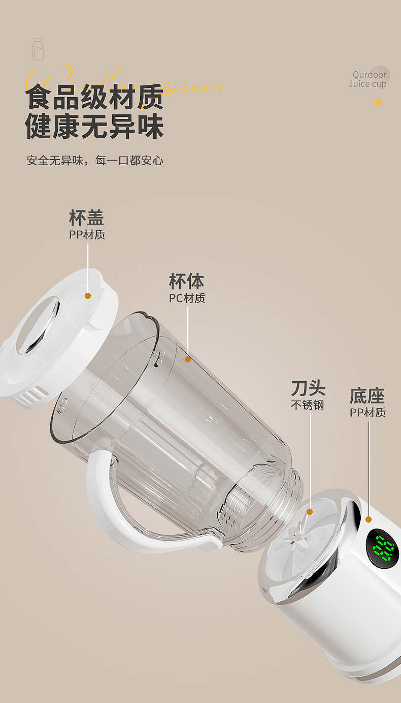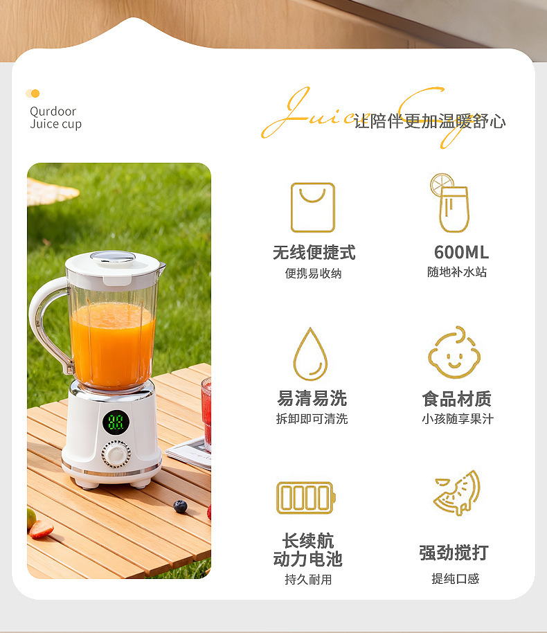Product standard configuration: lid, cup body, blade head, base, instruction manual, charging cable.