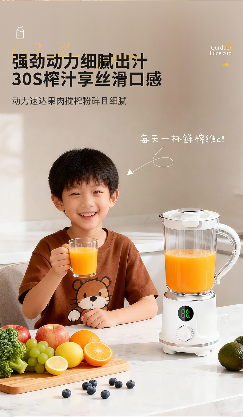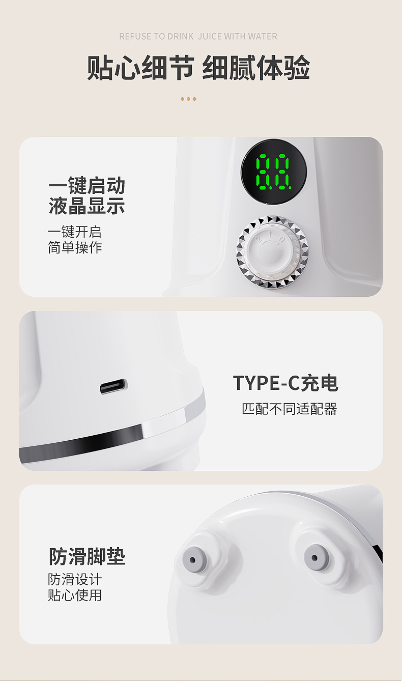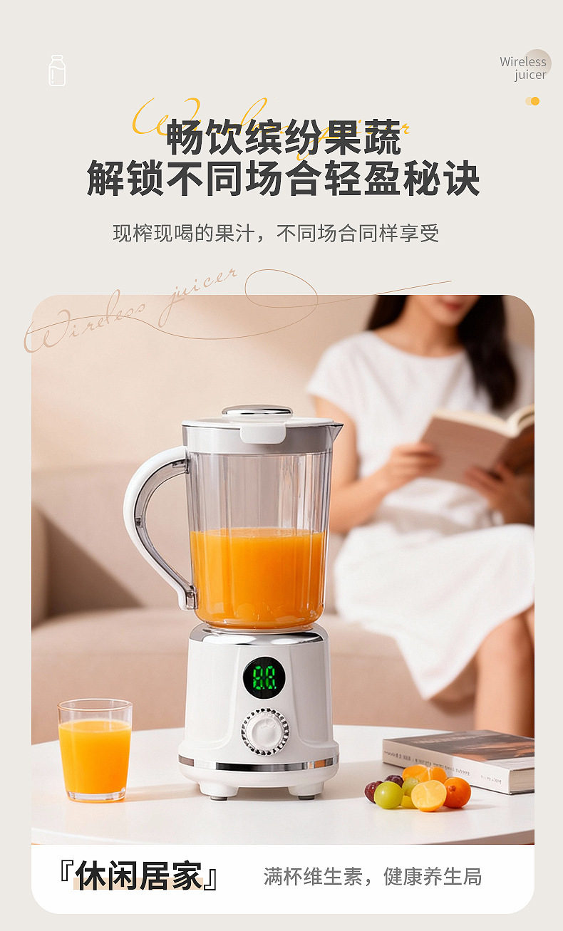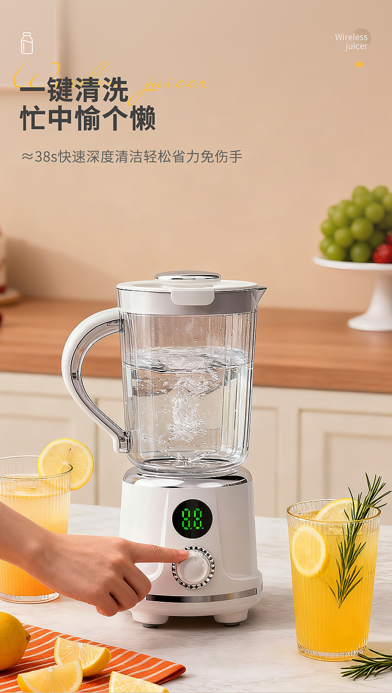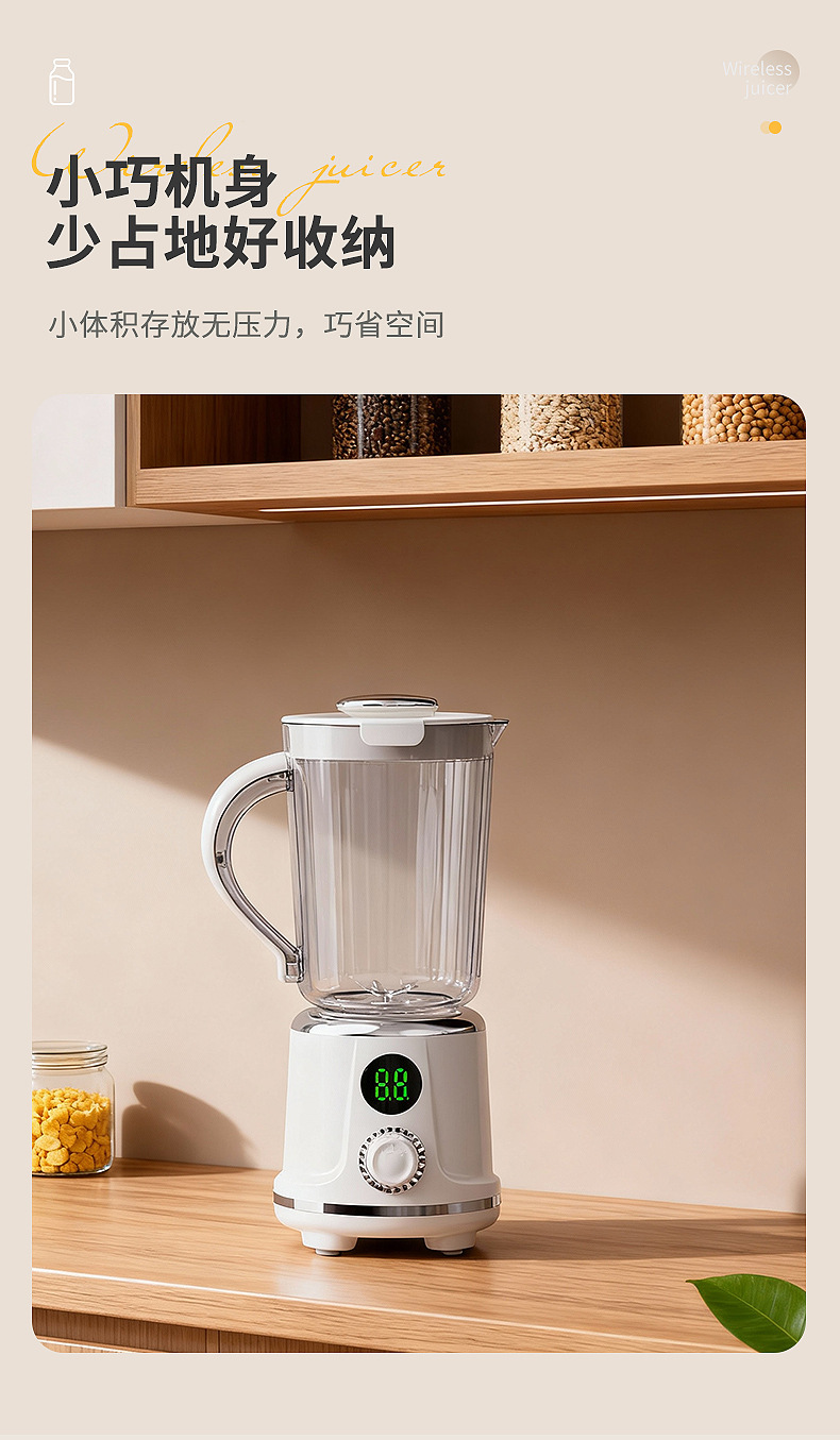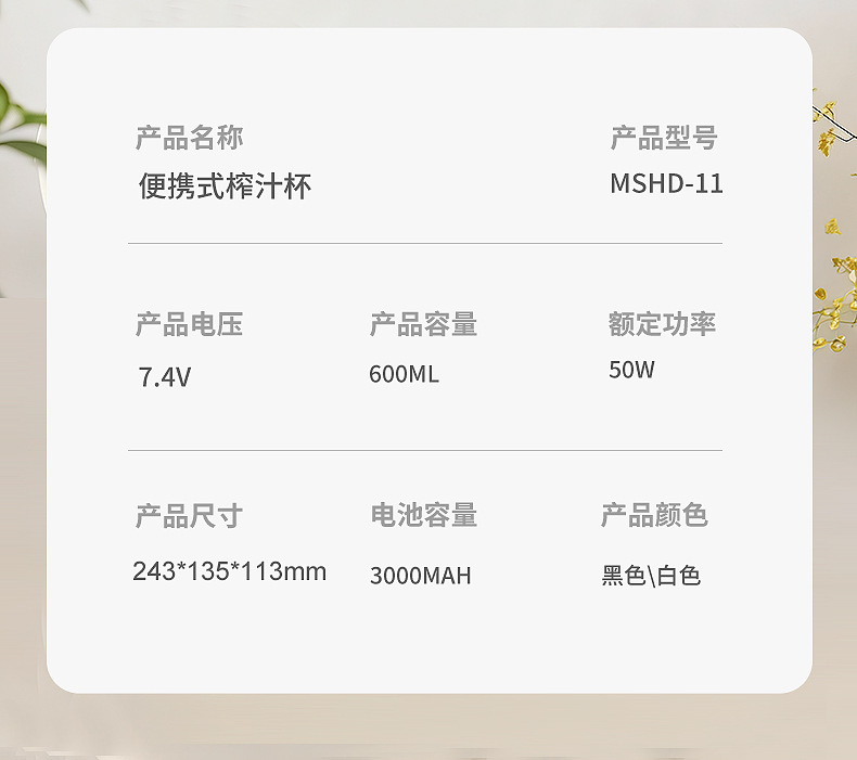 Product standard configuration: lid, cup body, blade head, base, instruction manual, charging cable.