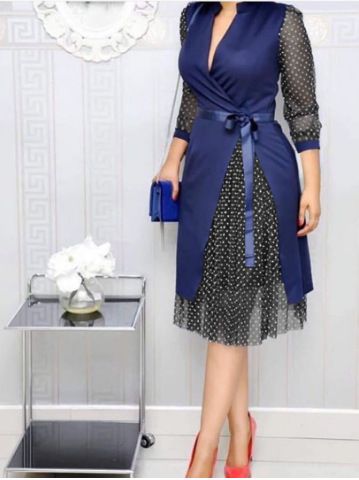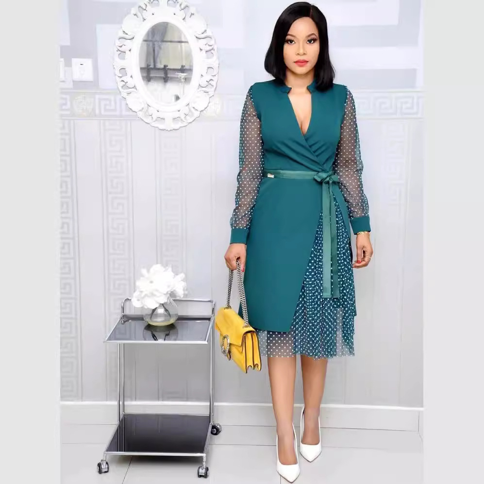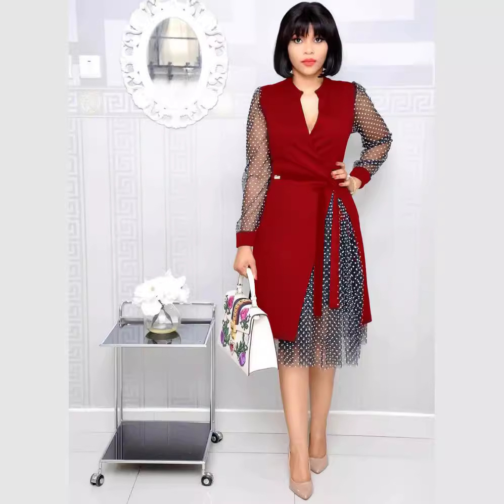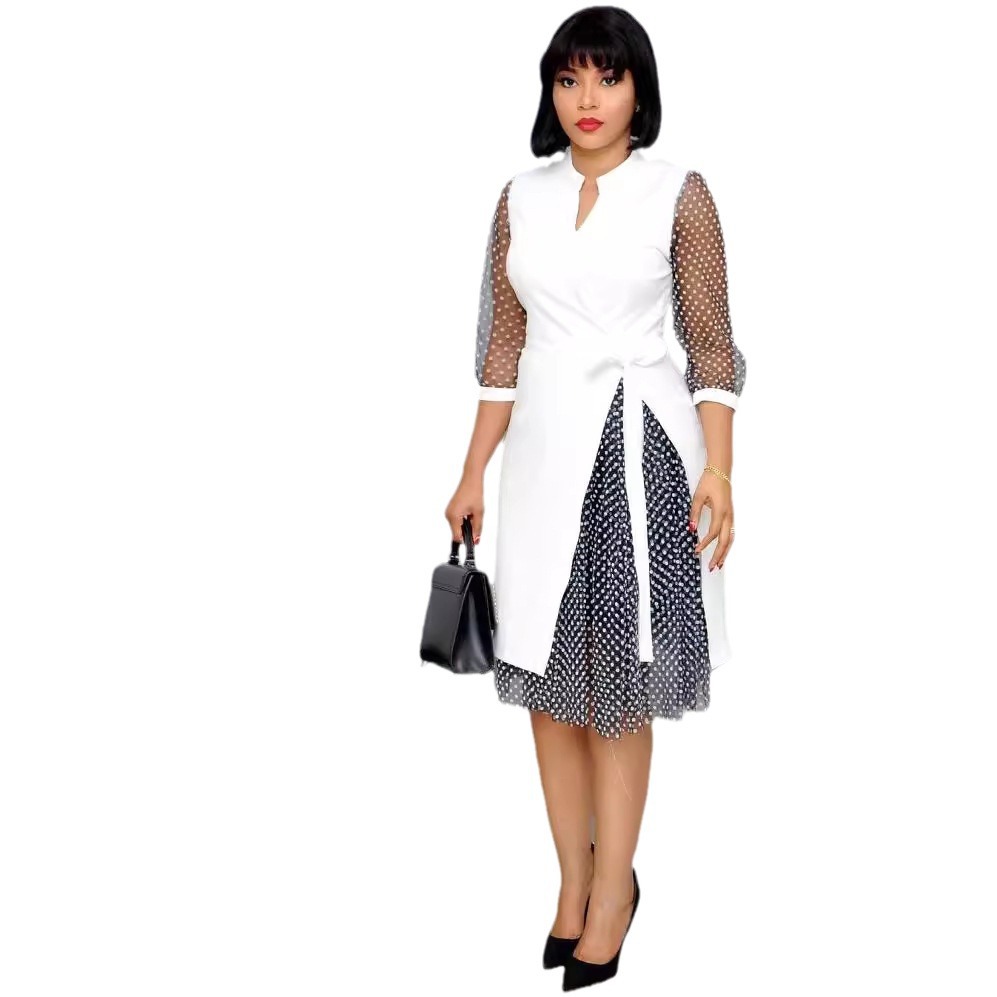 2025 cross-border foreign trade amazon africa new women's clothing v-neck stitching 3 layers dot mesh split dress