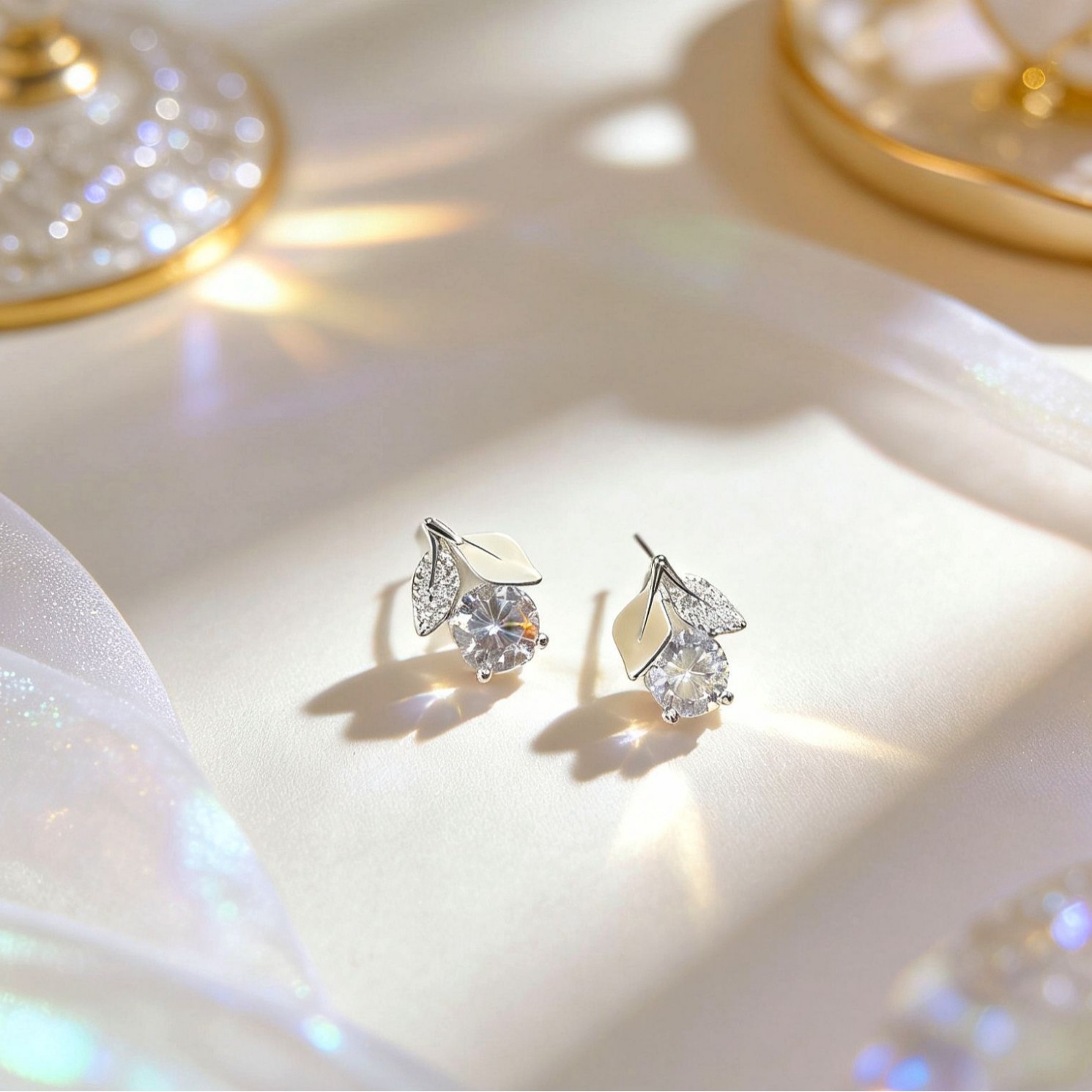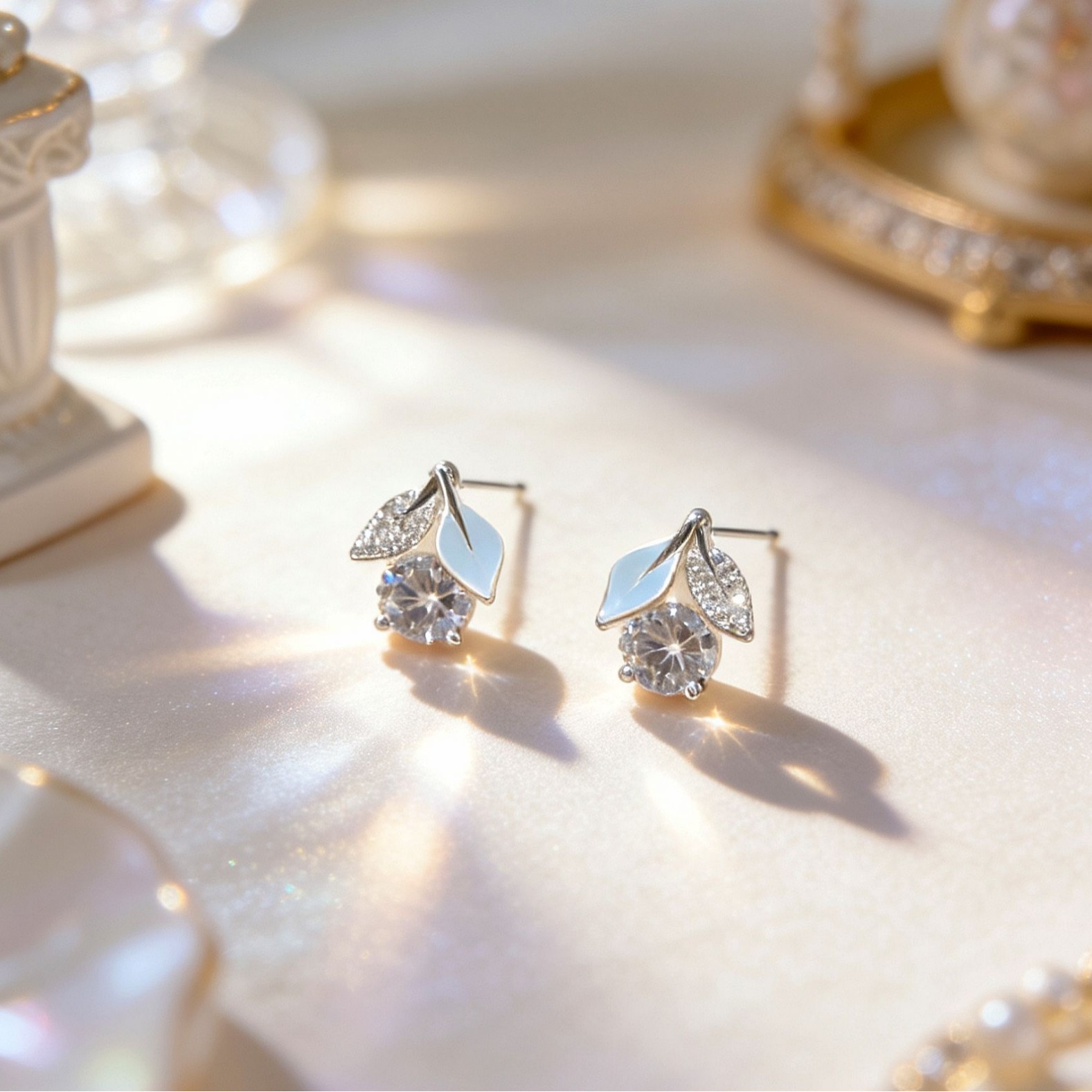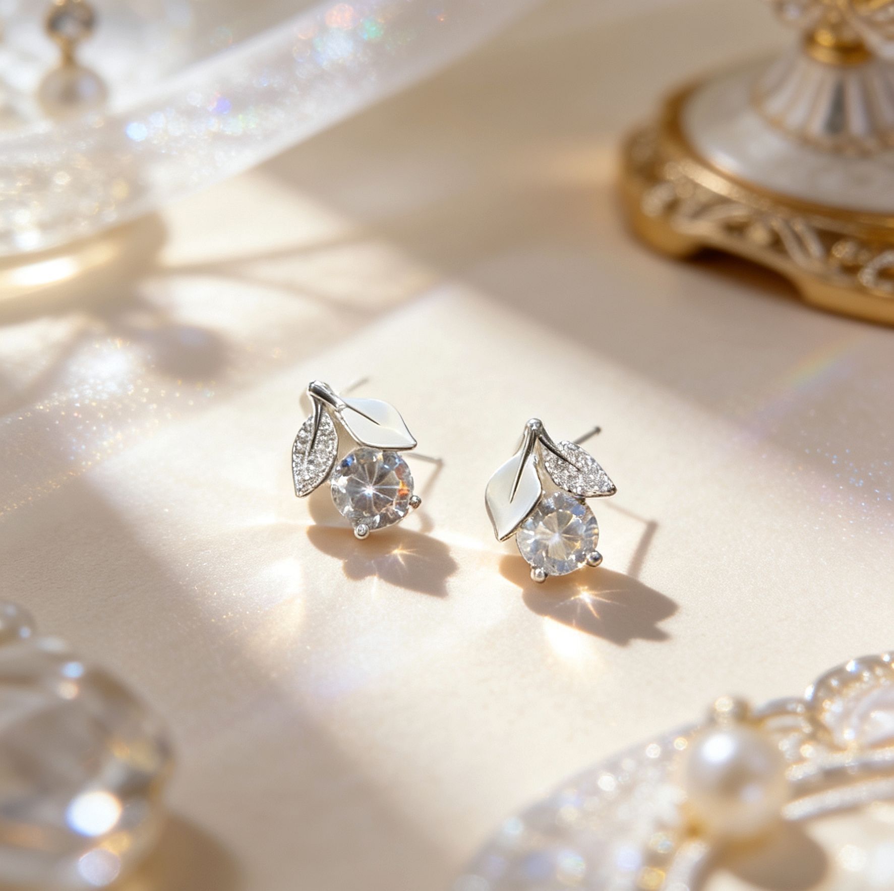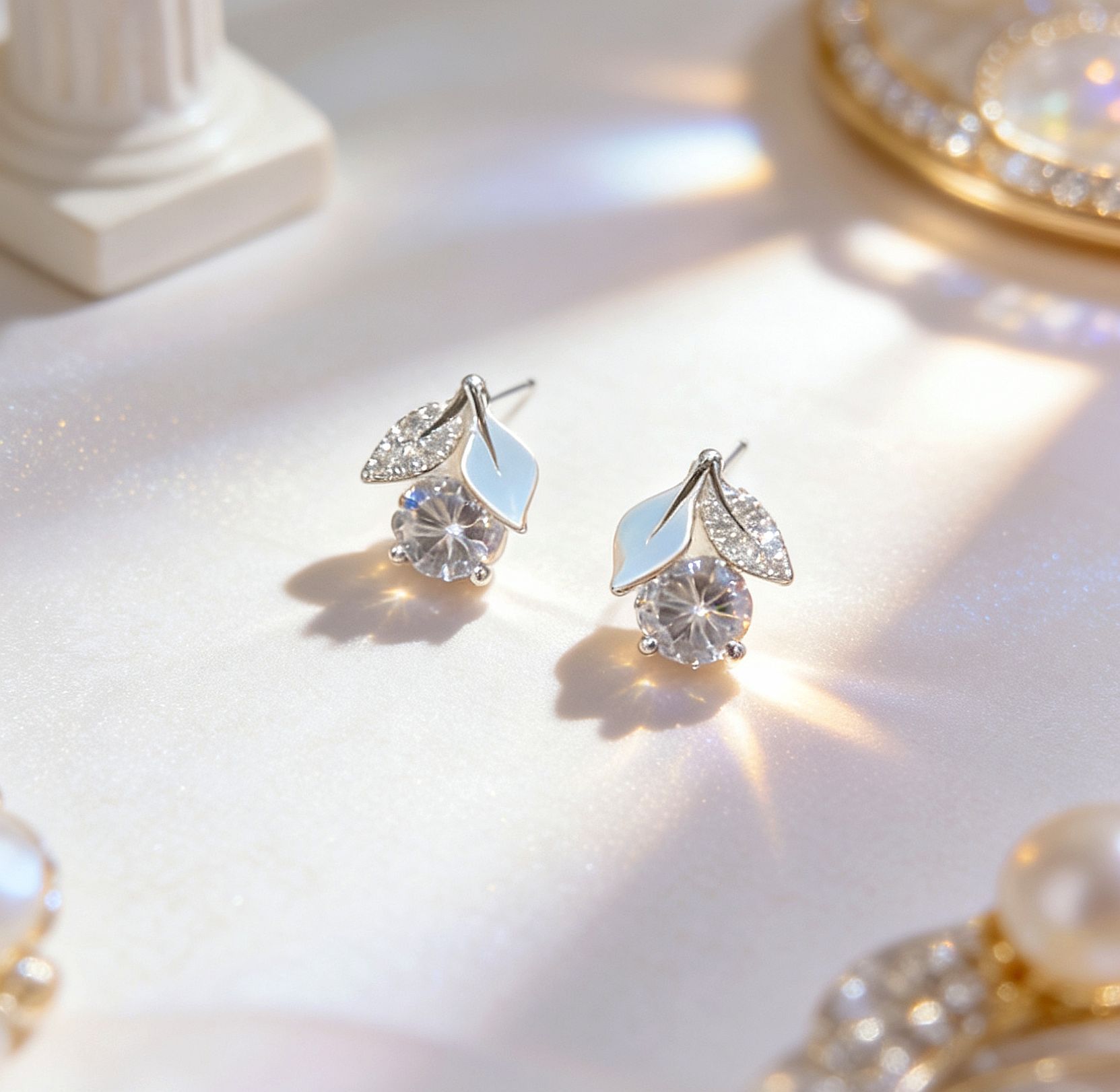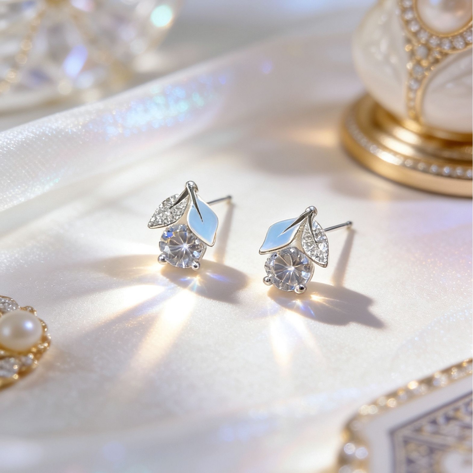 white leaf zircon cherry earrings