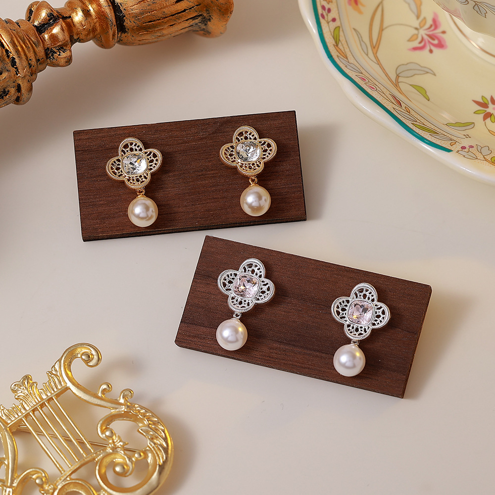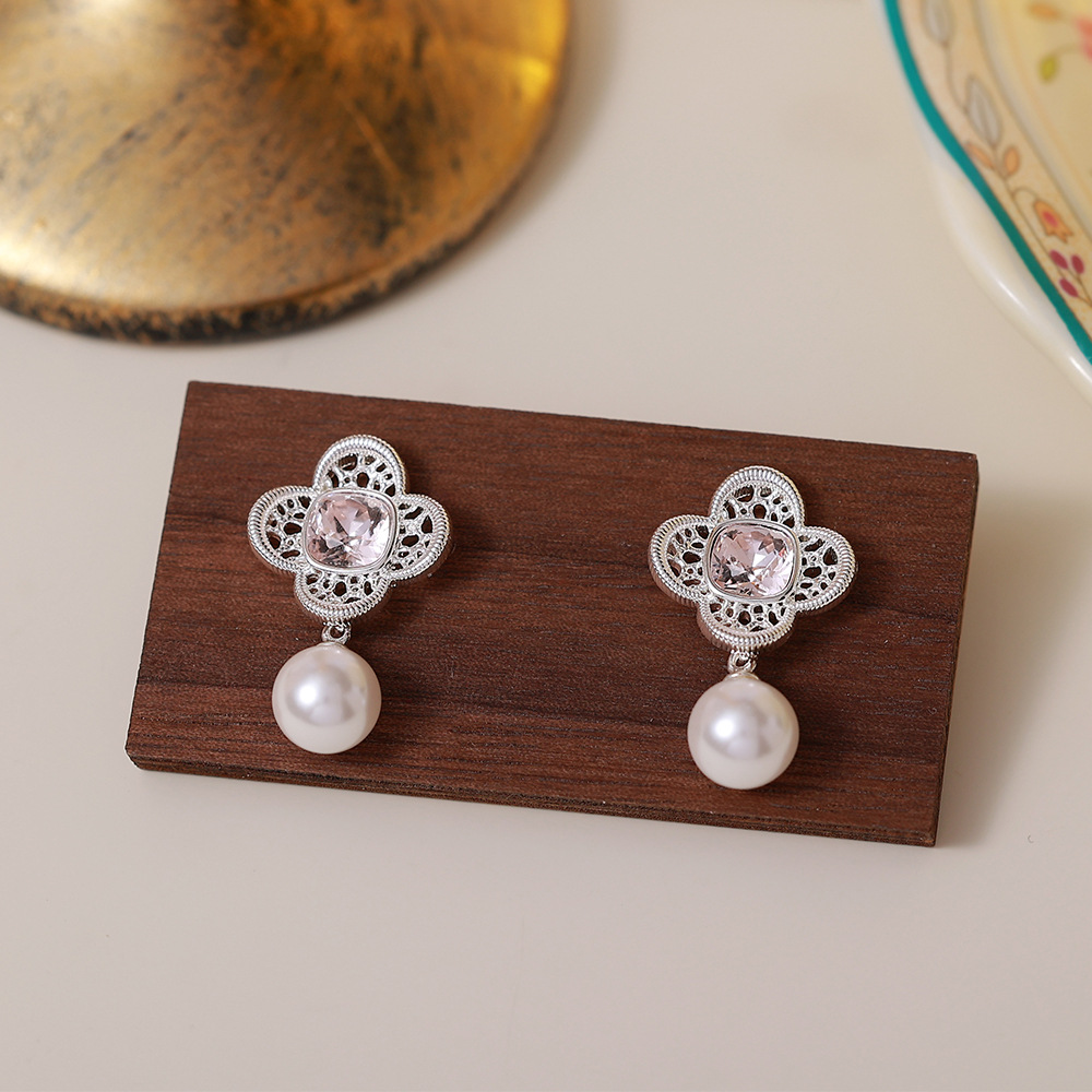 silver clover pearl eardrops stud earrings