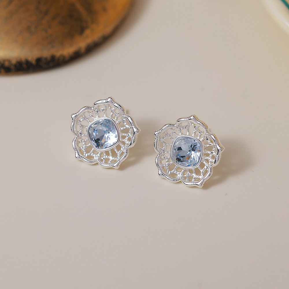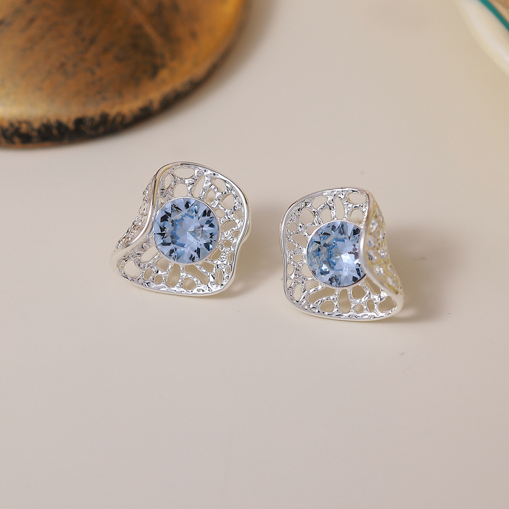 silver hollow blue zircon ear studs