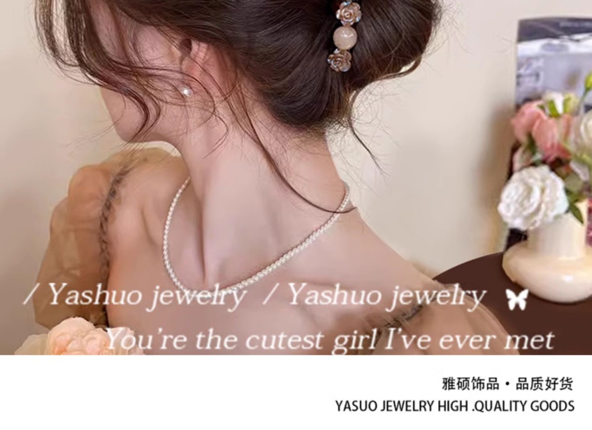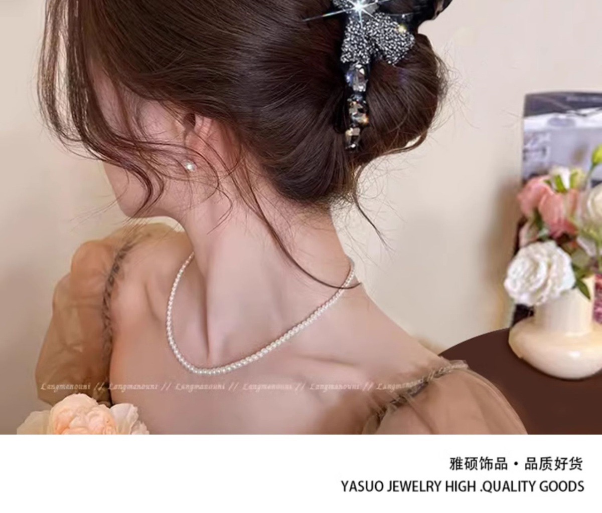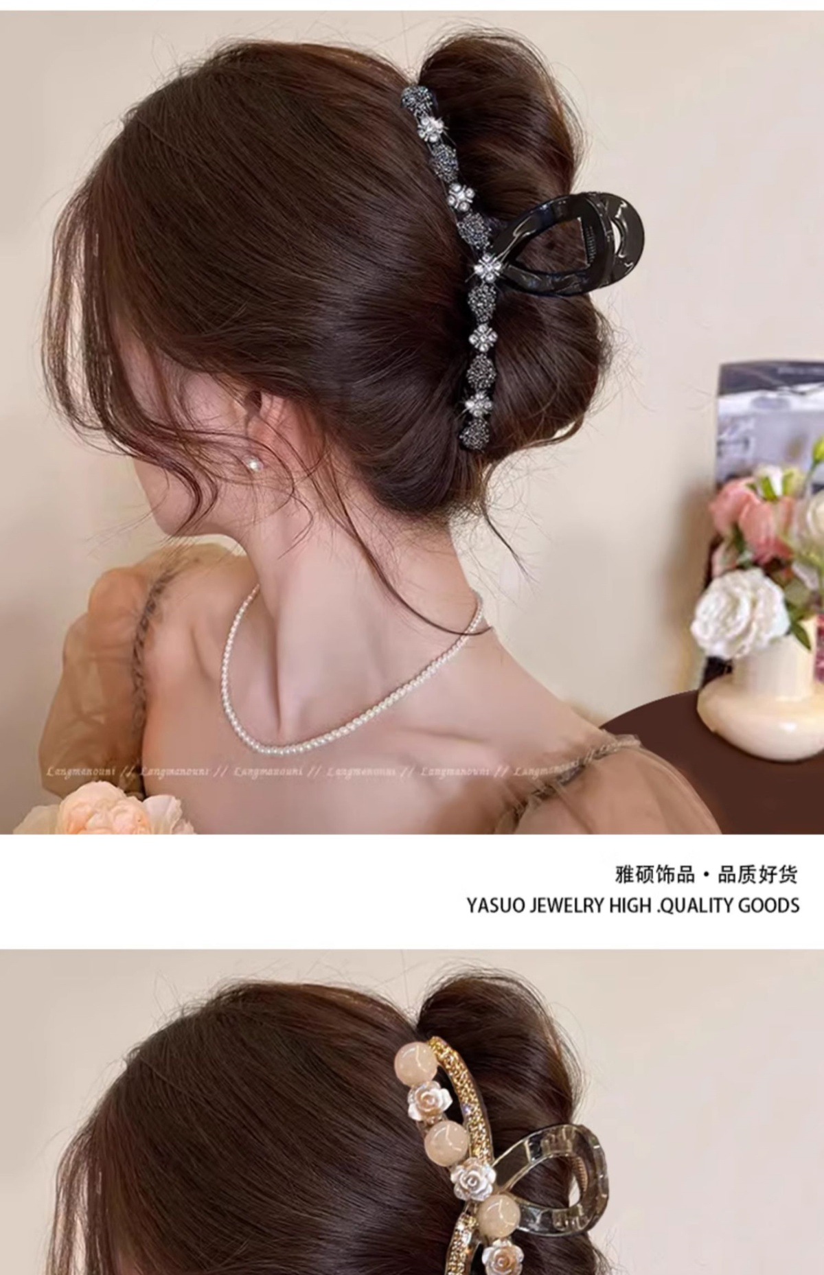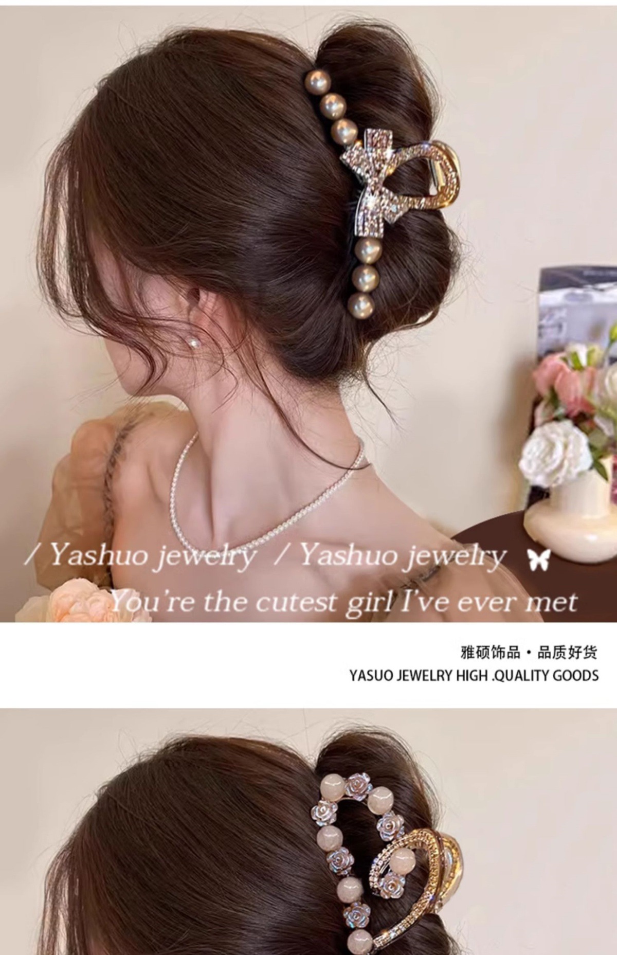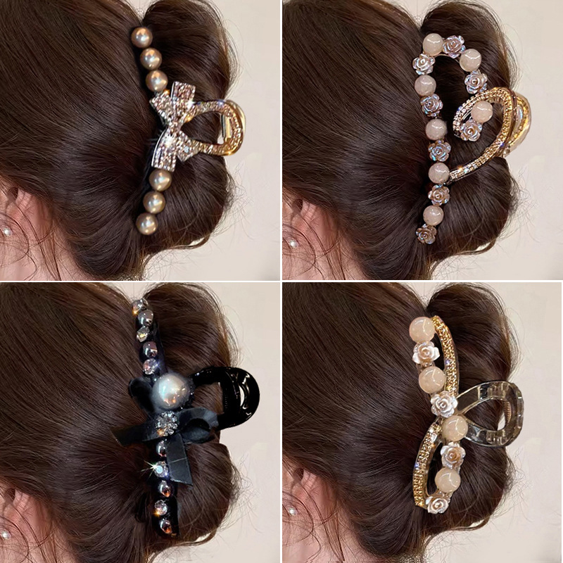 champagne-colored rhinestone bow pearl grip-11cm