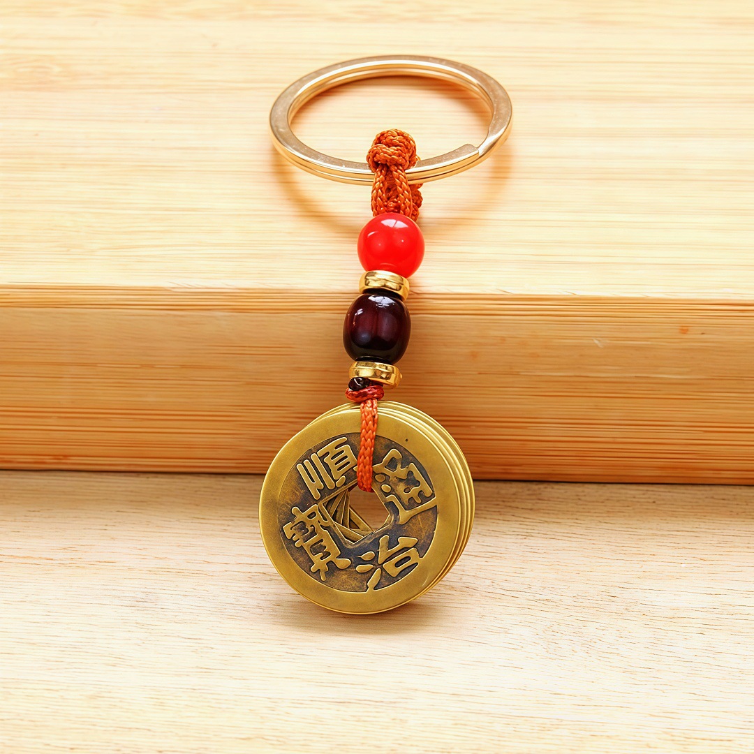 soil yellow wooden bead-five emperor coins keychain