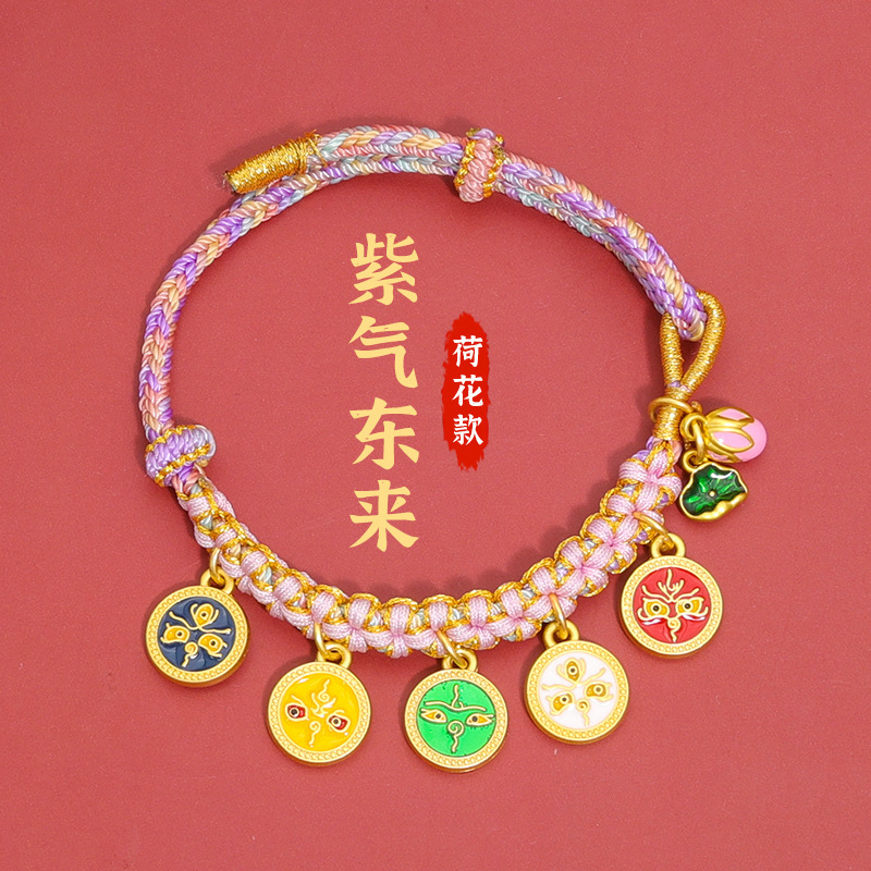 15-piece peach blossom knot bracelet, five fortune gods + lotus style-purple