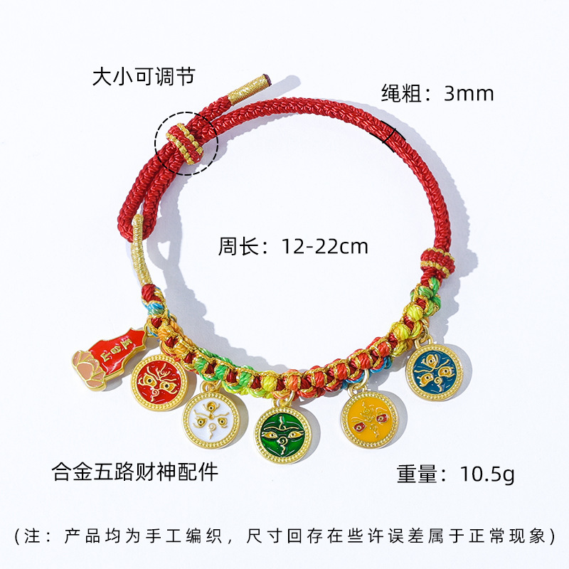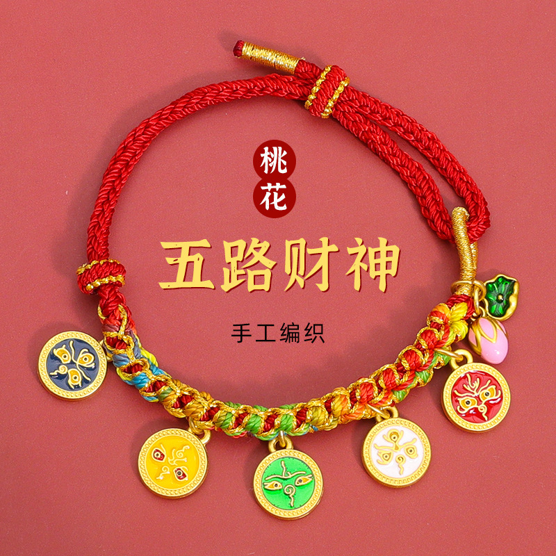 5-piece peach blossom knot bracelet, five deities of wealth + lotus style-bright red