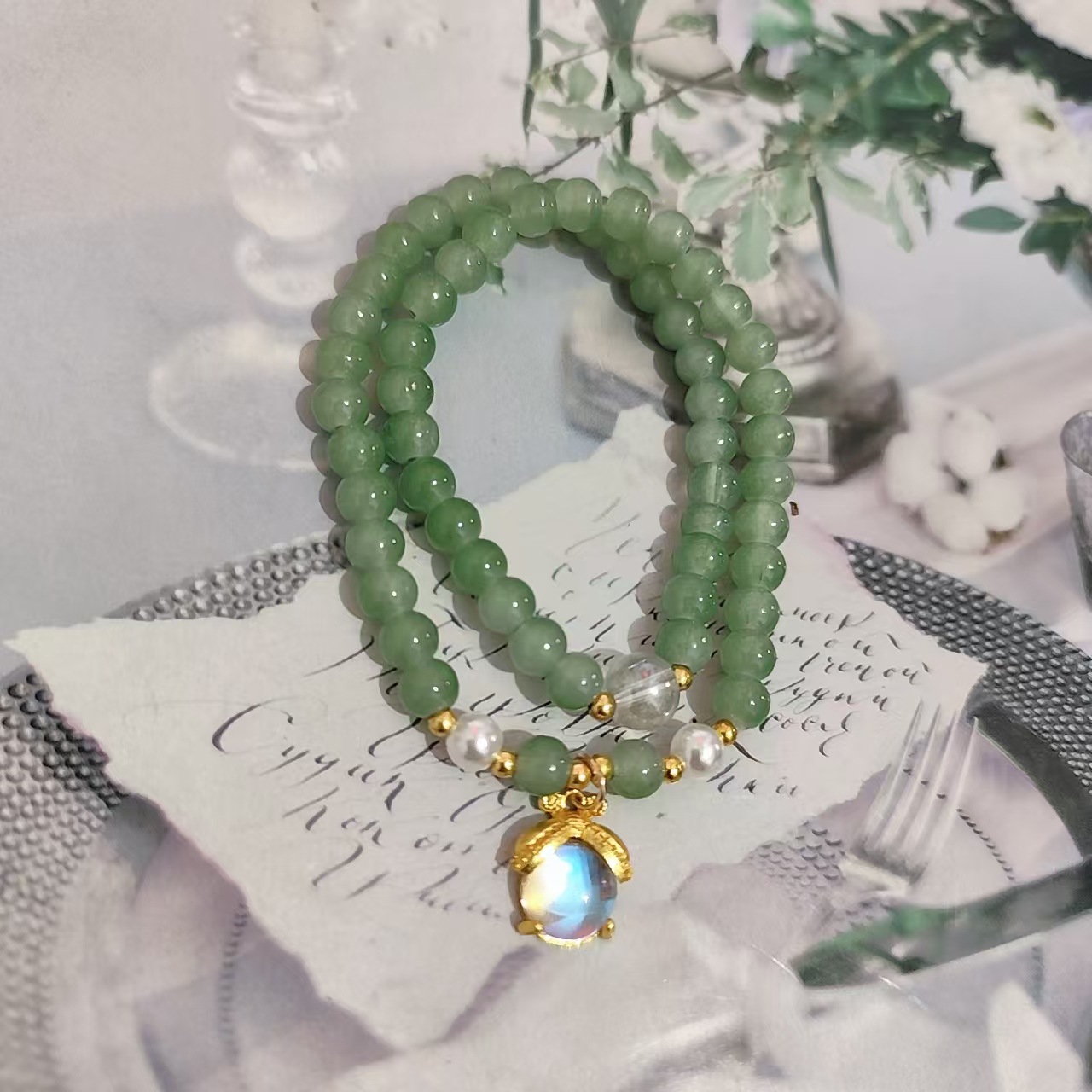 q1 double ring aventurine green white plate bracelet