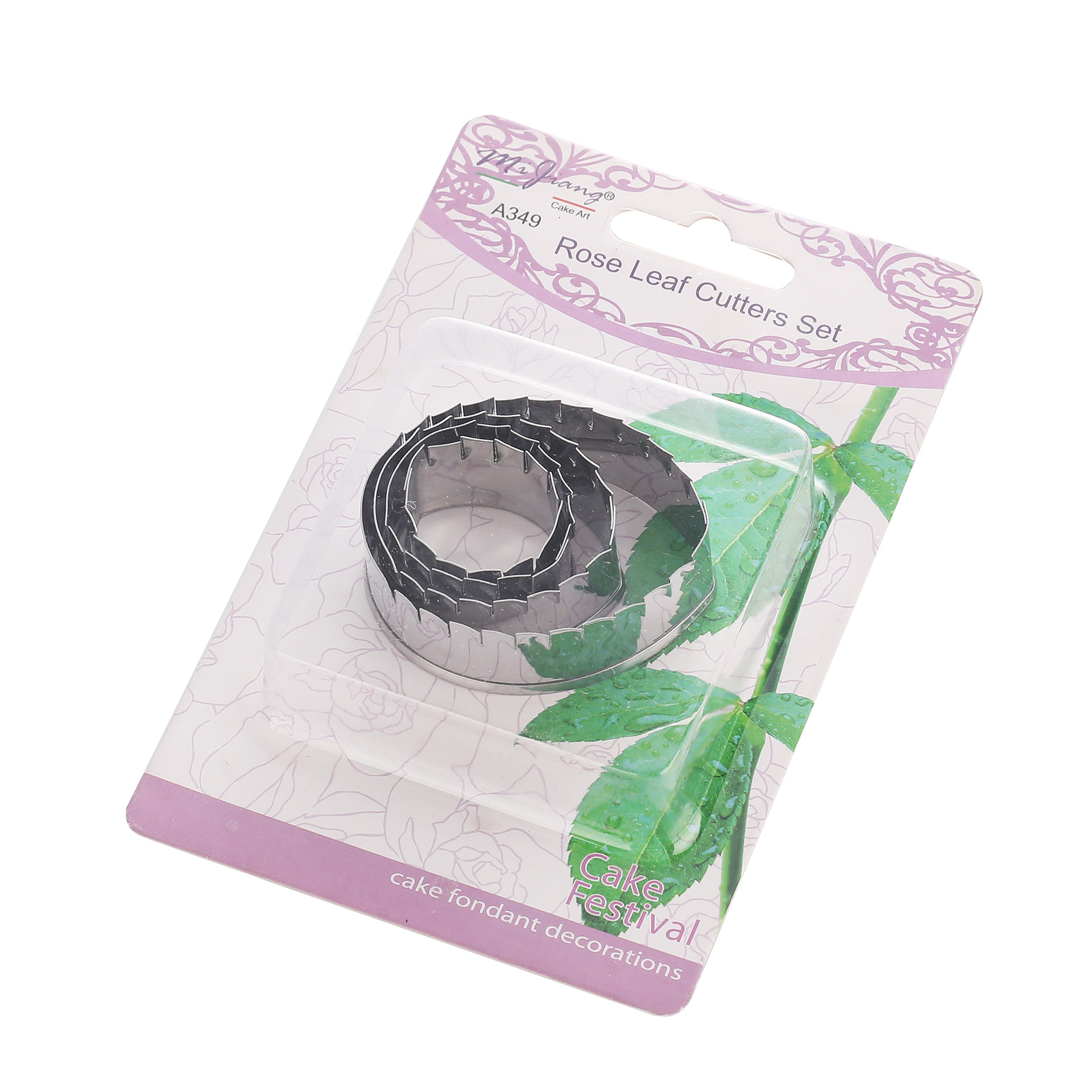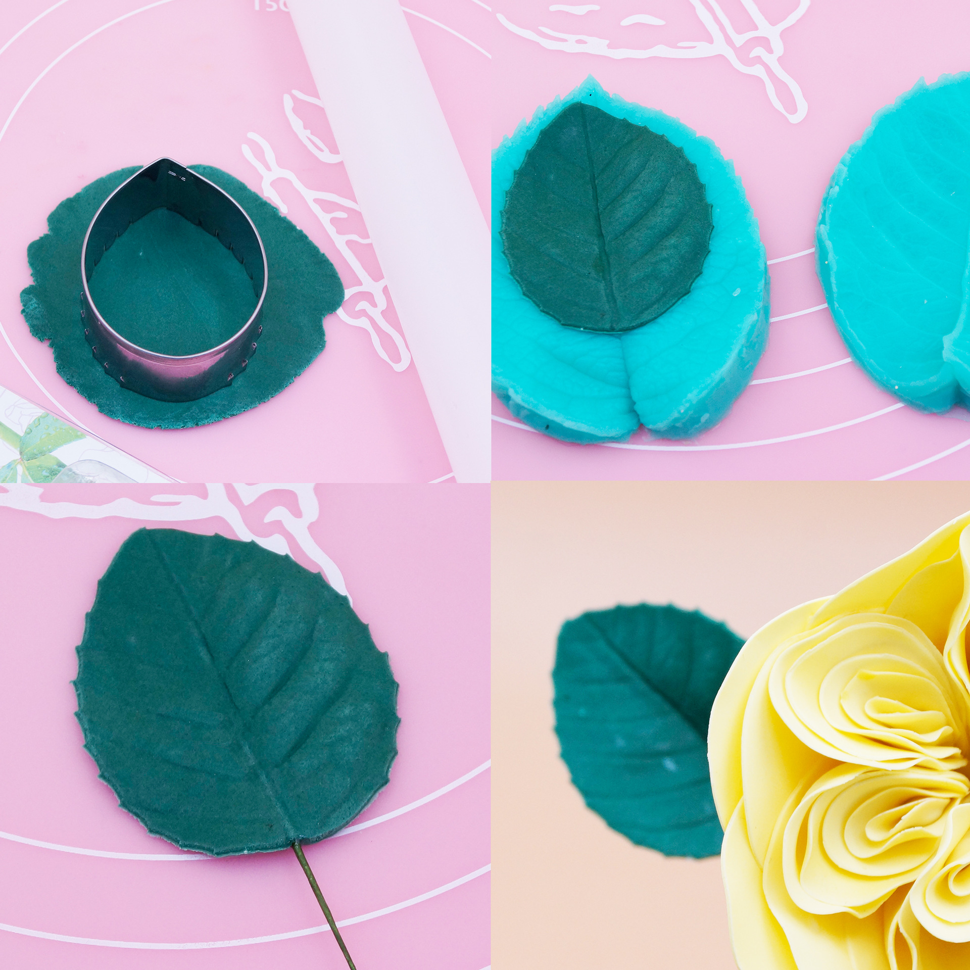 Instructions: First, place the fondant on the fondant silicone mat and roll it flat with a rolling pin. Then, cut 2-3 identical-sized leaf shapes using the four different designs of this petal mold. Insert a wire into the center of the leaves in advance. Place the leaves on a sponge mat and use the stainless steel carving set to roll the edges of the leaves to create a three-dimensional leaf edge. Then, apply the prepared food coloring to the leaves and place them on a flower drying mat to dry for a while. Once the leaves are set, combine leaves of different sizes and place them with the roses.