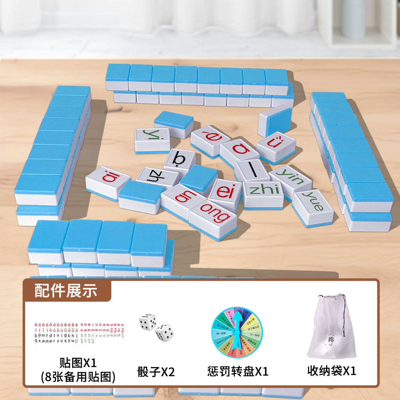 pinyin alphabet mahjong [blue] 88 tablets + dice + pinyin sticker + buggy bag + punishment plate