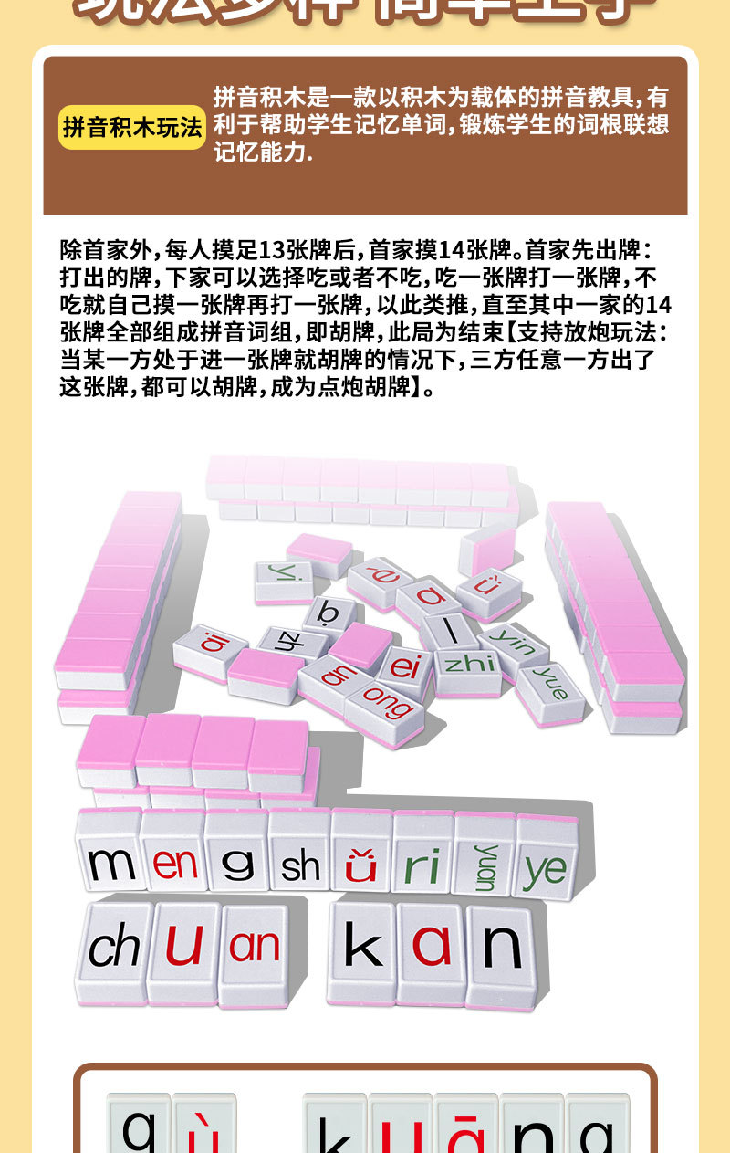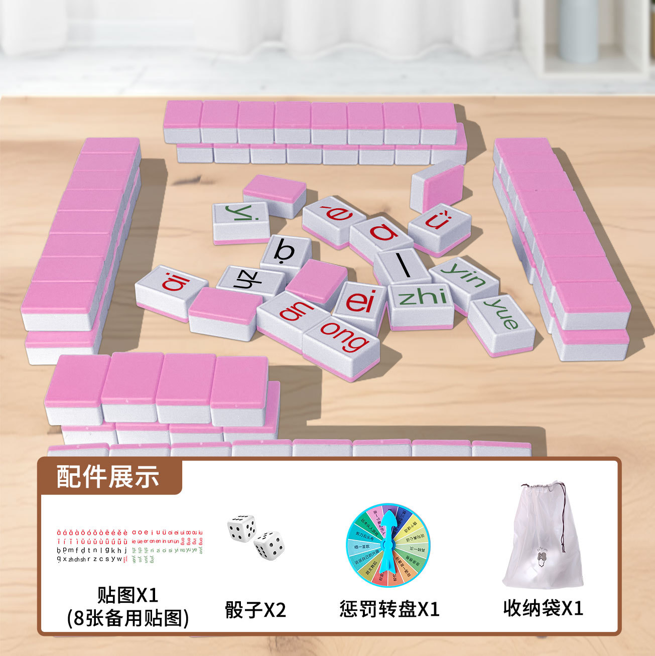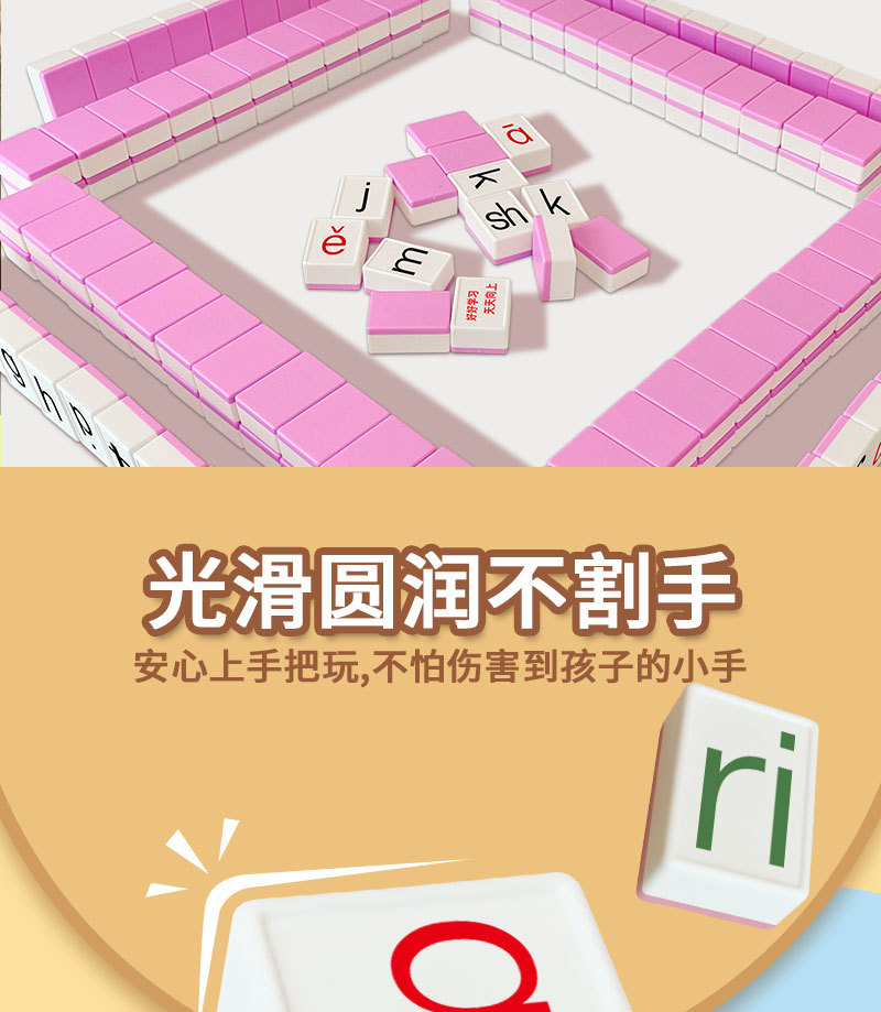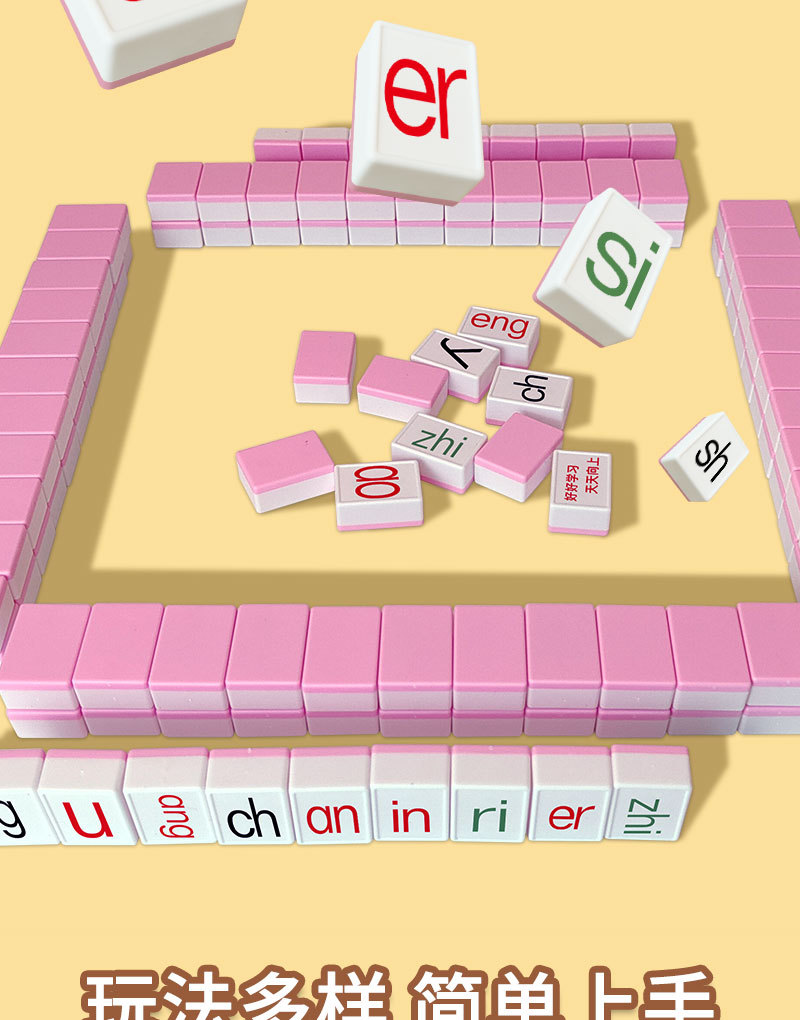 pinyin alphabet mahjong [pink] 88 tablets + dice + pinyin stickers + buggy bag + punishment plate