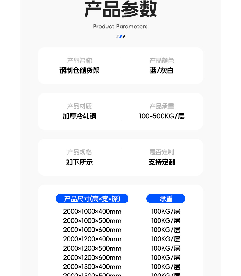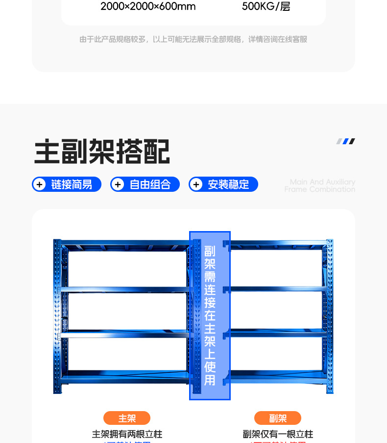 | 2000mm high x 2000mm long x 600mm deep, four-tier heavy-duty rack, 500kg capacity per bay, with an auxiliary rack. | CN¥ 589.9 |