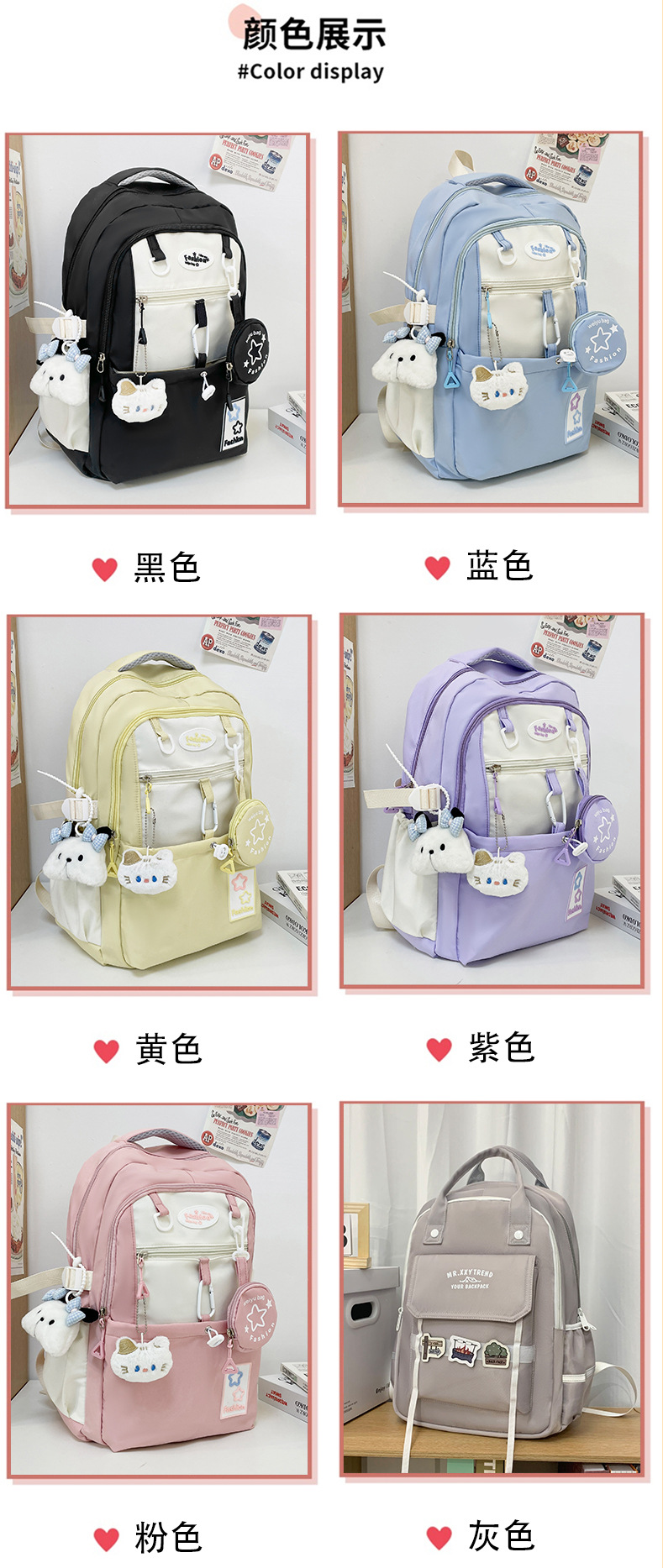 color: yellow, blue, pink, black, purple