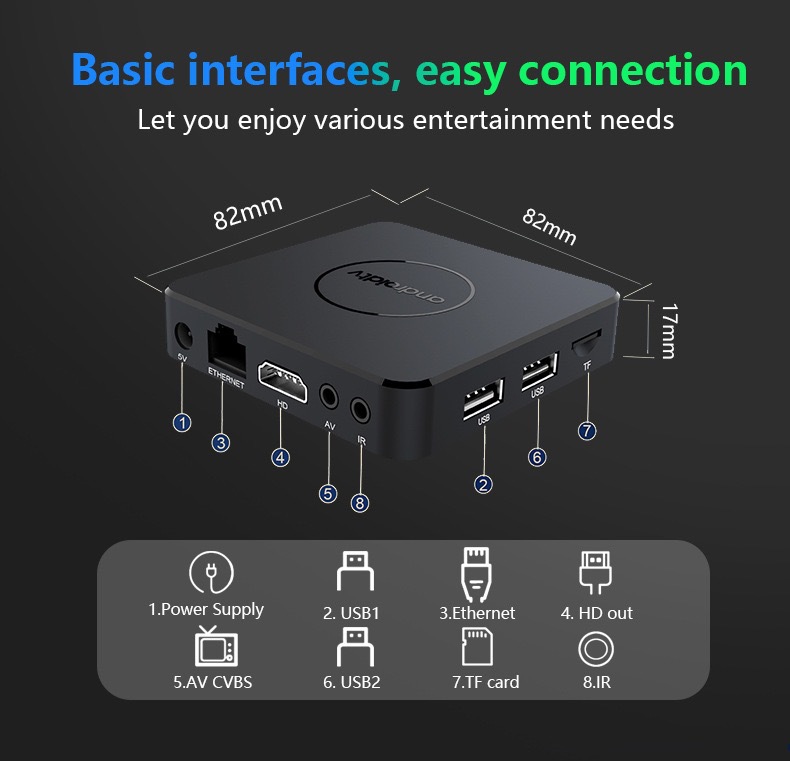 4、ProductPacking StandardList: set-top box + power supply + HDMI cable + remote control + instruction manual.