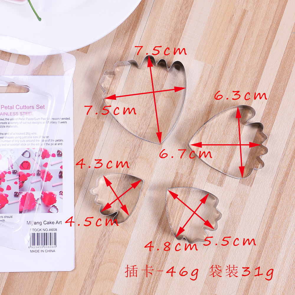 Instructions: First, place the fondant on the fondant silicone mat and roll it flat with a rolling pin. Then, cut out 2-3 petals of the same size using the four different designs of this petal mold. Insert a wire into the center of each petal and place it on a foam mat. Use the stainless steel carving set to roll the edges of the petals to create a three-dimensional effect. Next, apply the prepared food coloring to the petals and place them on a drying mat to allow them to dry for a while. Once the petals are dry and set, arrange them from smallest to largest to create a beautiful and realistic peony flower.