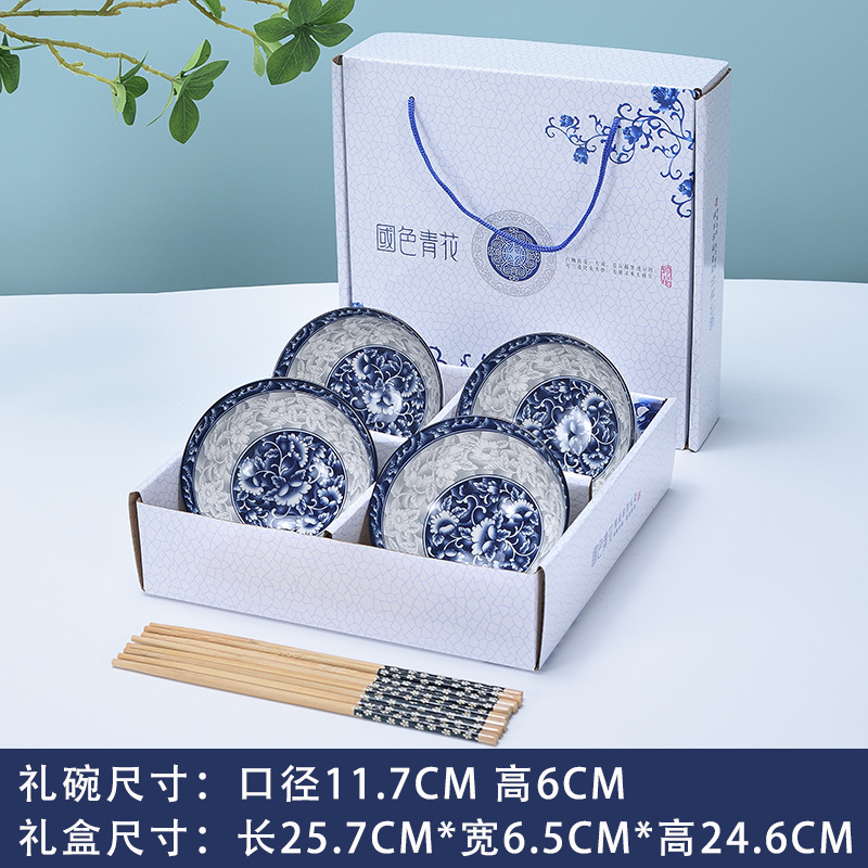 high-grade blue and white 4 bowls 4 chopsticks (4.5 inch bowl) portable packaging