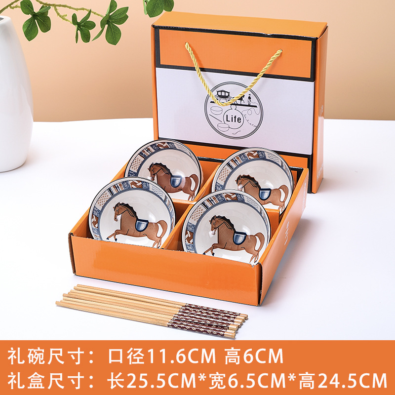 horse 4 bowls 4 chopsticks (4.5 inch bowl) portable packaging