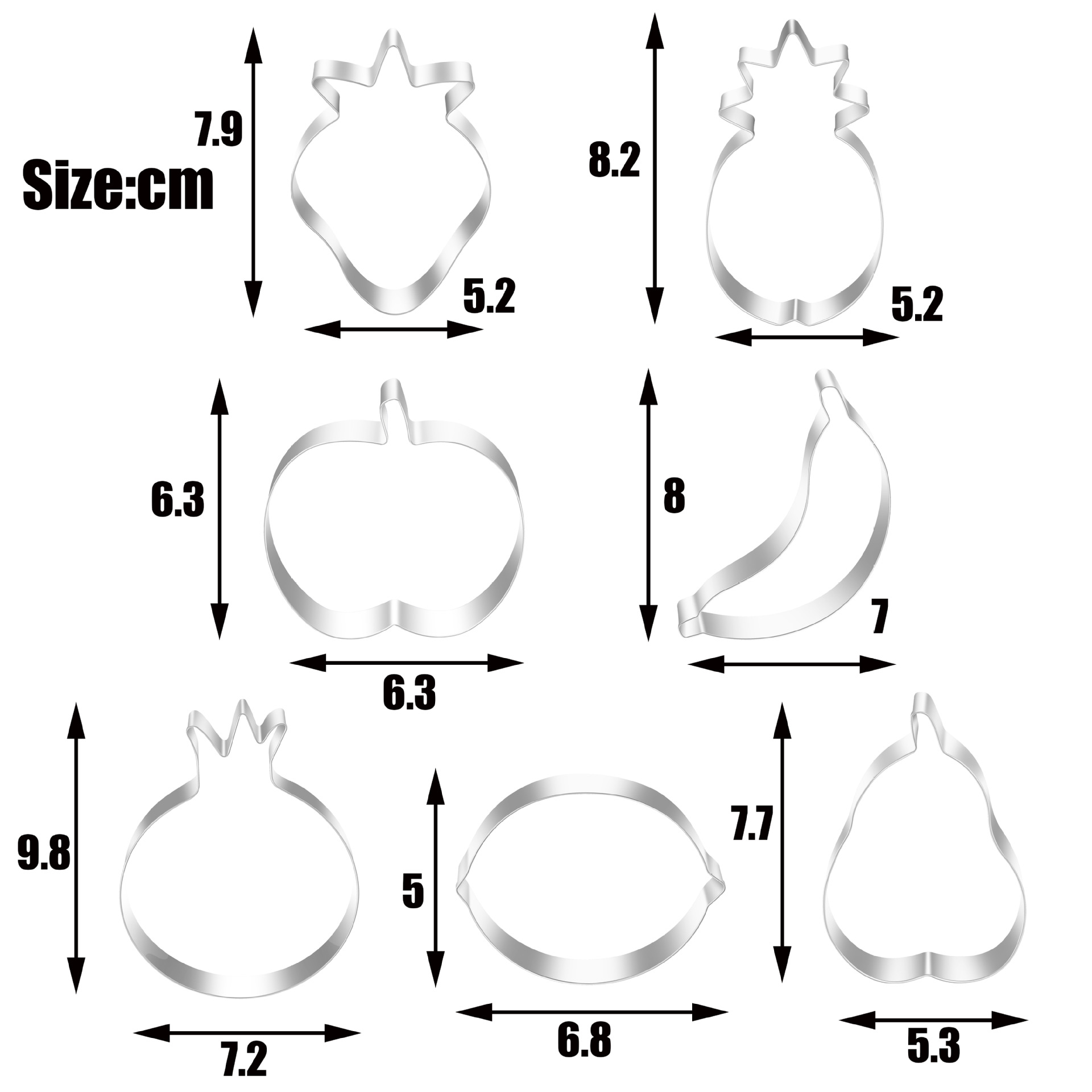 Usage: Used for cookie making, a set of 7-piece combination of fruit shapes including pineapple, pomegranate, banana, apple, lemon, strawberry, widely applied in ceramic, clay, soft clay, etc.