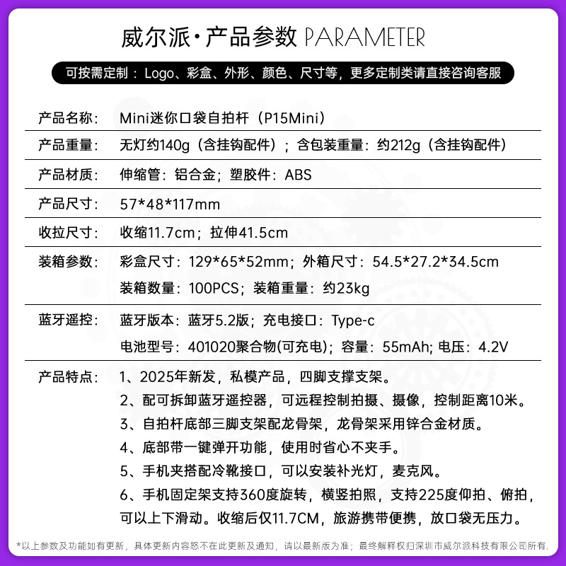 p15mini mini selfie stick/black gray/no light