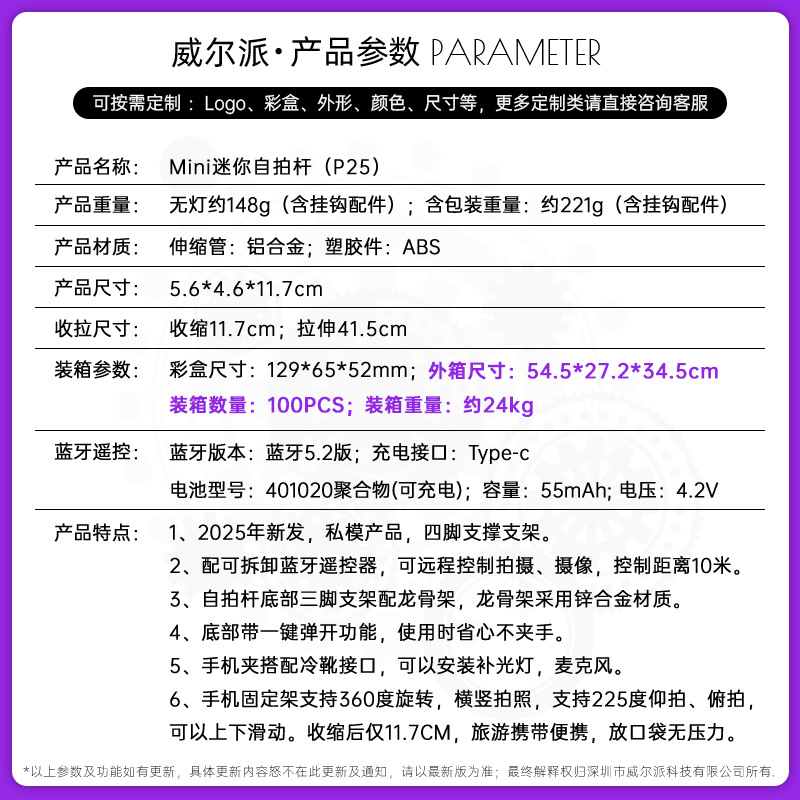 p25 mini selfie stick/black/no light