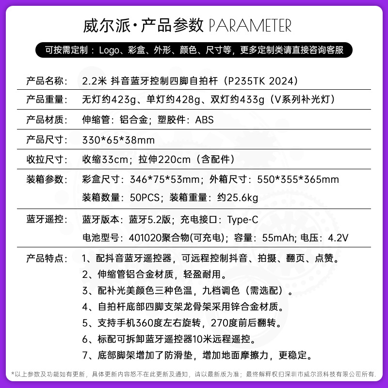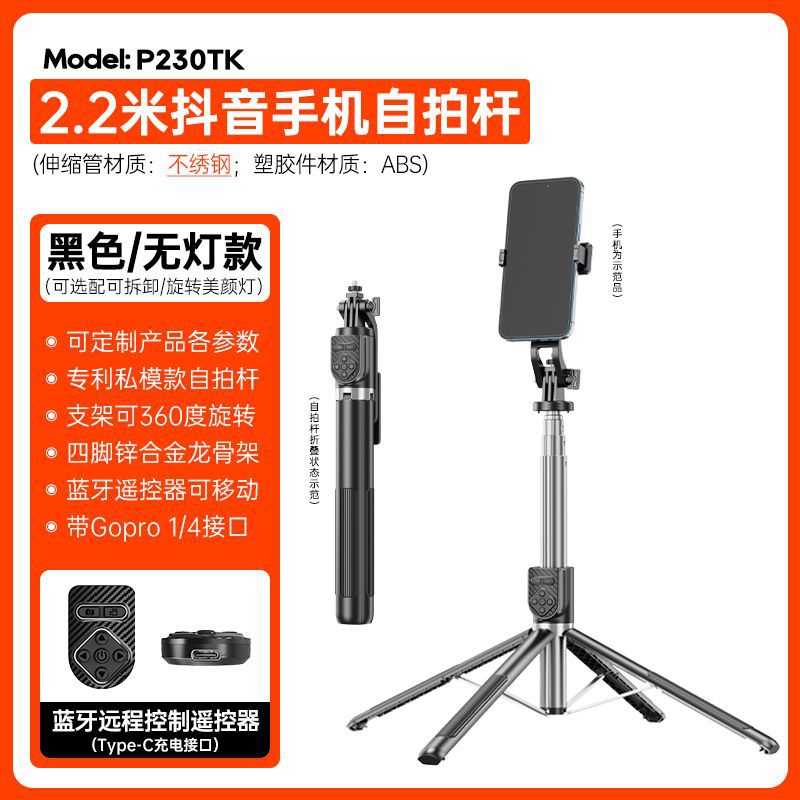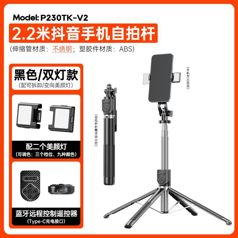 p230tk-v2/tiktok remote control selfie stick/stainless steel/double lamp
