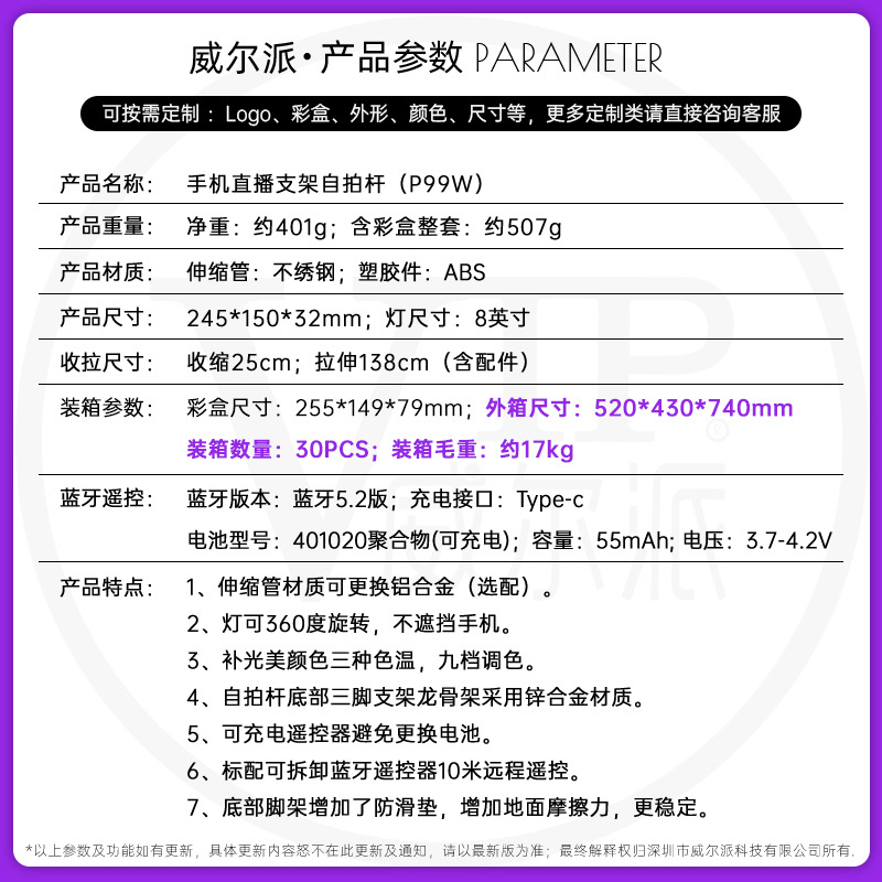p99w stainless steel 8-inch fill light selfie stick