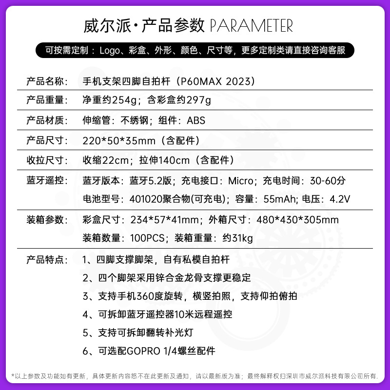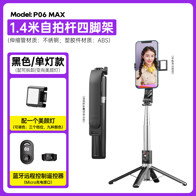p06max-v1/stainless steel selfie stick/black/single lamp