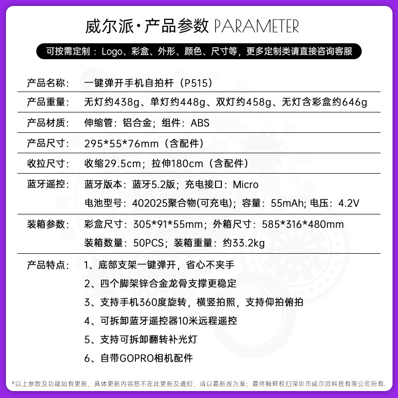 p515-v2 selfie stick bluetooth selfie stick/1.8 m/aluminum alloy/double light