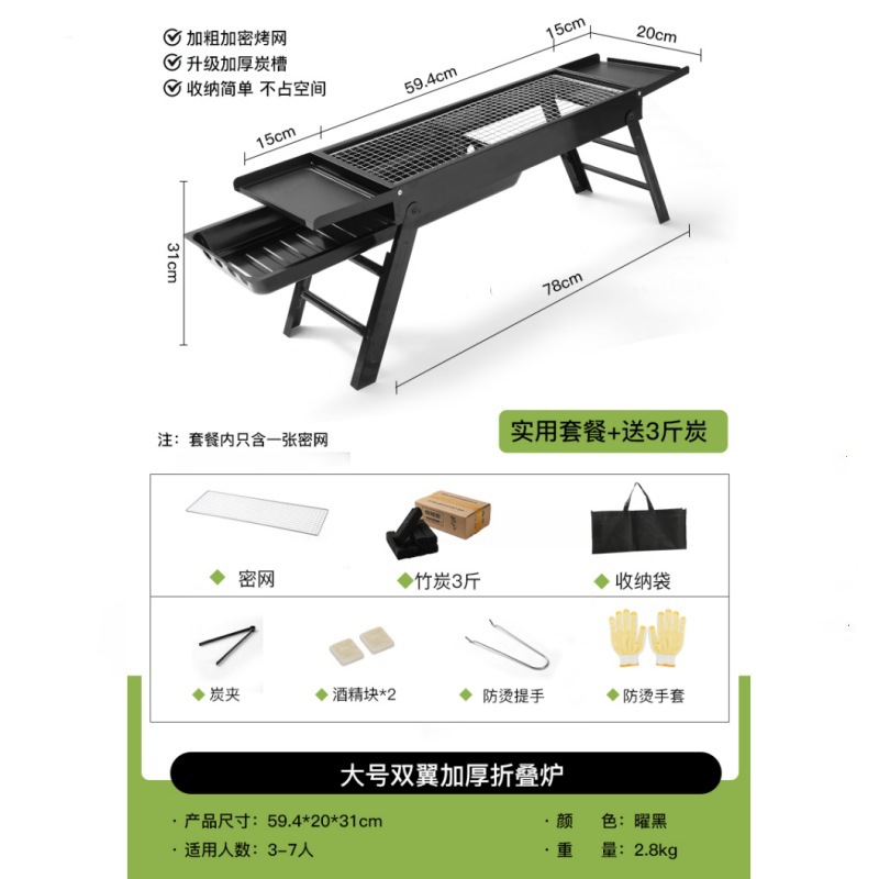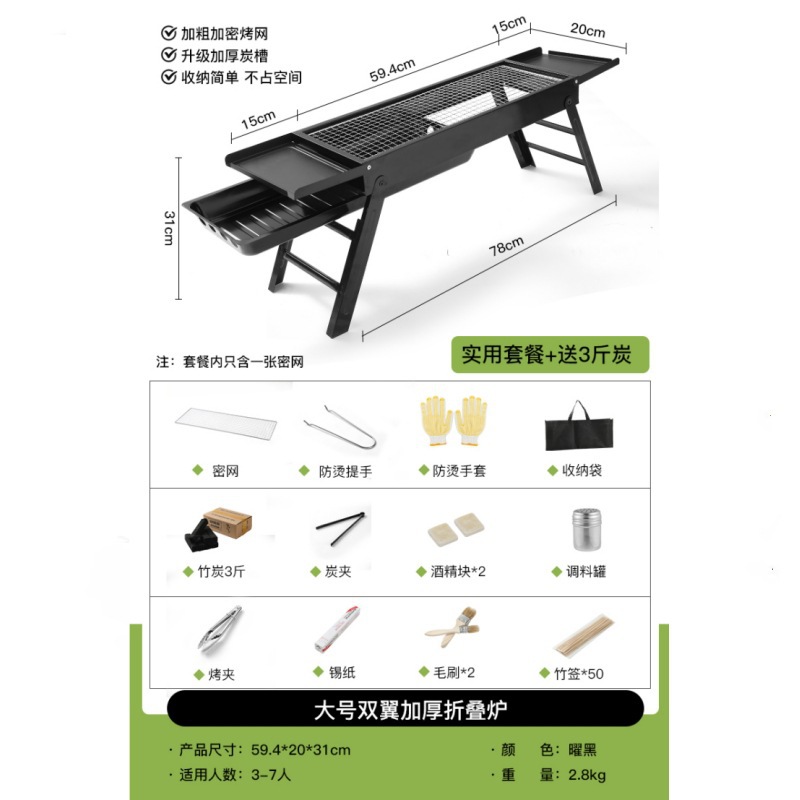 double-wing large oven [strip bbq grill + barbecue 10-piece set +1.50kg charcoal] installation-free folding stove