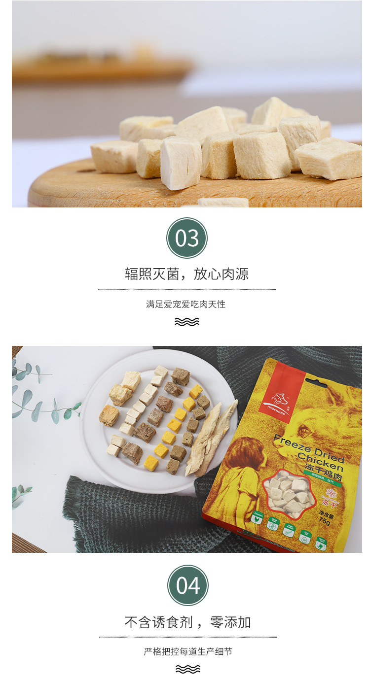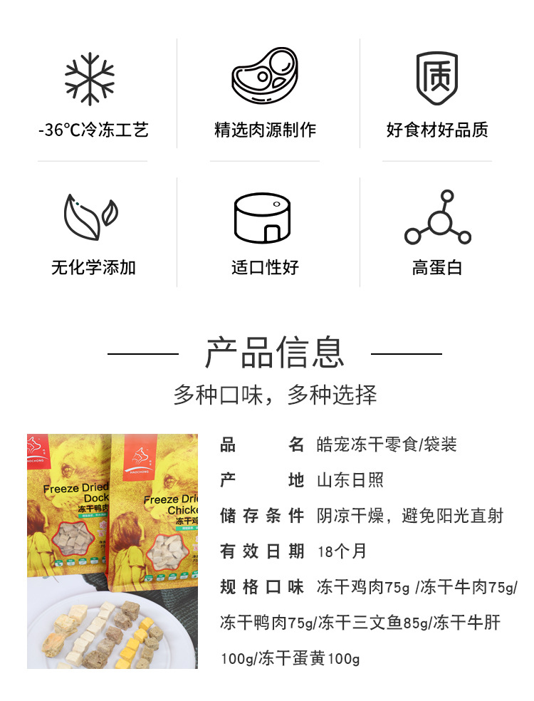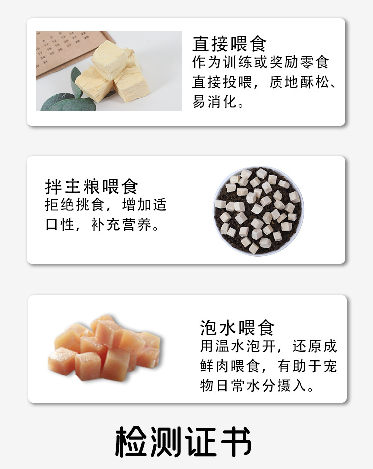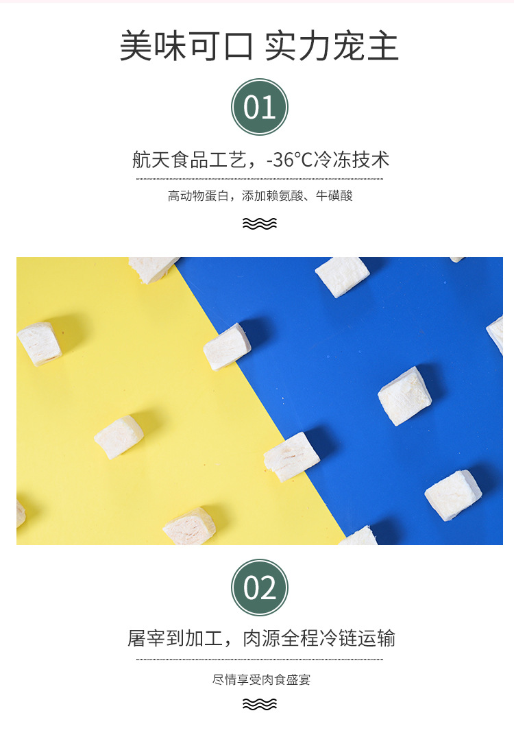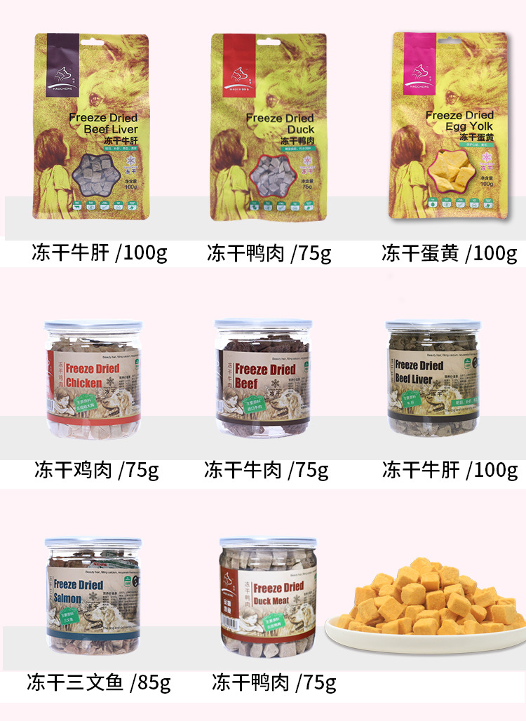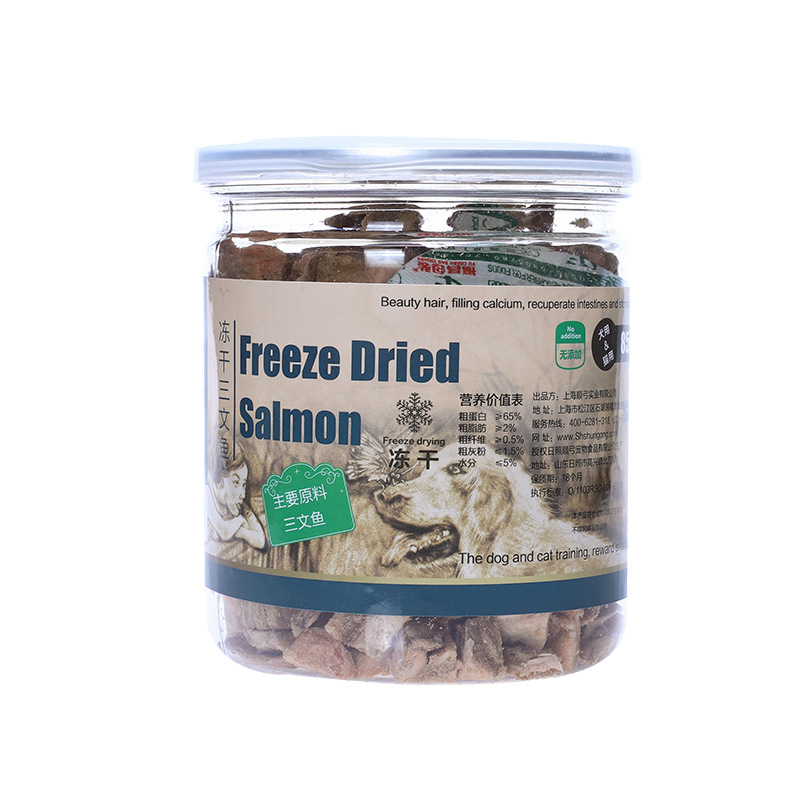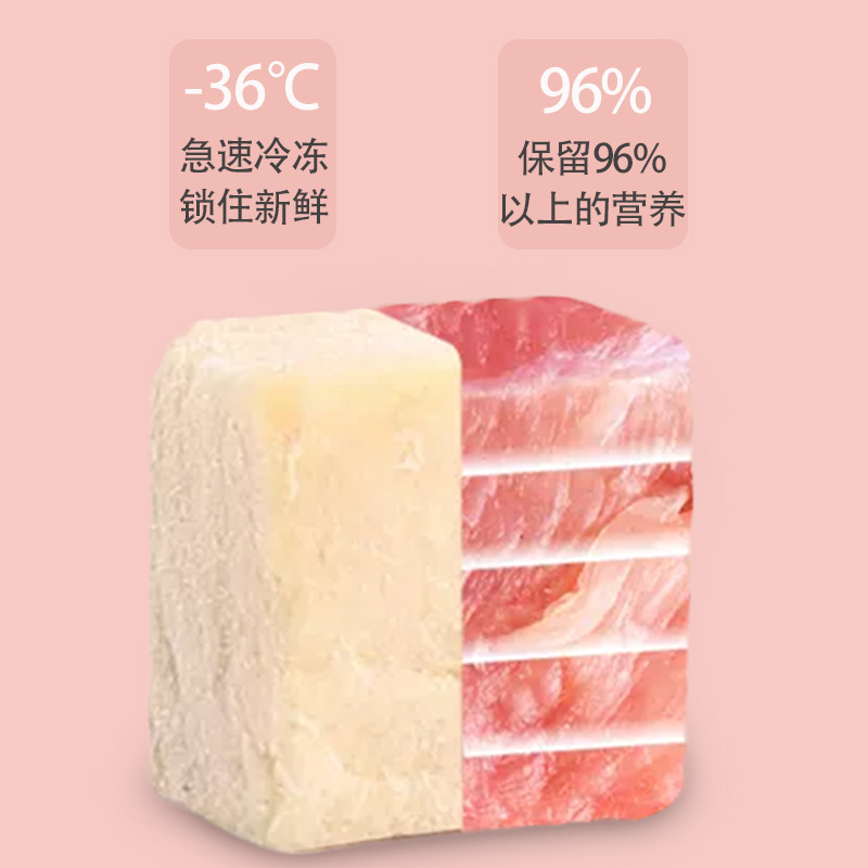 Based on the production records and extensive statistical data analysis of Rizhao Shungong Pet Food Co., Ltd., a real and stable freeze-drying process and process control have been established. It has been found that raw materials including chicken, duck, cod, salmon, beef, rabbit, lamb, egg yolk, and chicken liver, as well as fruits and vegetables, after being subjected to low-temperature freeze-drying, only 20% of the raw materials are converted into finished products. The finished products retain their nutritional components such as protein, fat, ash, and fiber intact, except for the loss of water. Essentially, five times the weight of the raw materials are concentrated into only one times the weight of the finished product through freeze-drying. The nutrients are not lost, and the products are easy to store and preserve. Therefore, the products in this shop claim a 5:1 concentration of ingredients, and the concentration in this shop only refers to the weight concentration of ingredients and nutrition.
