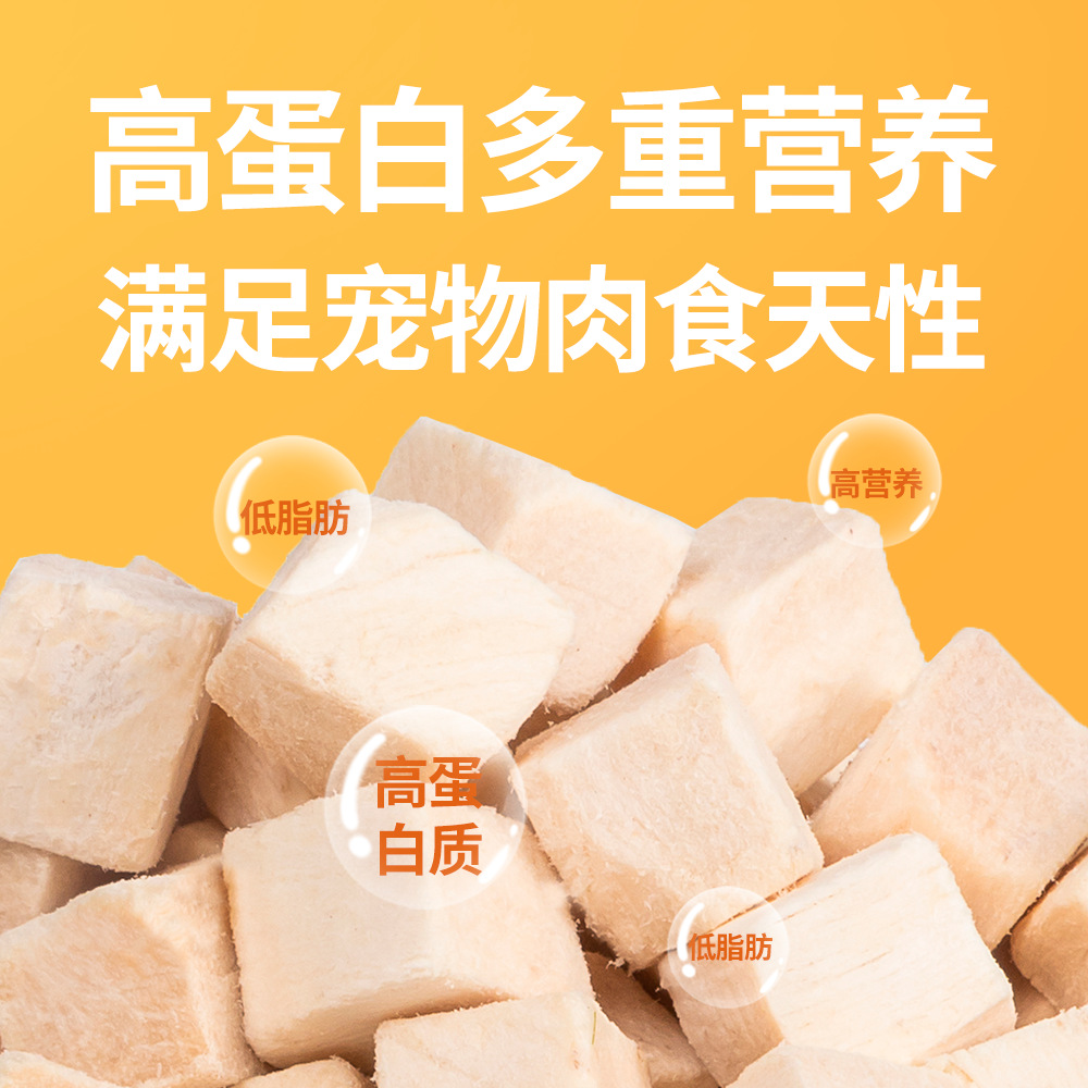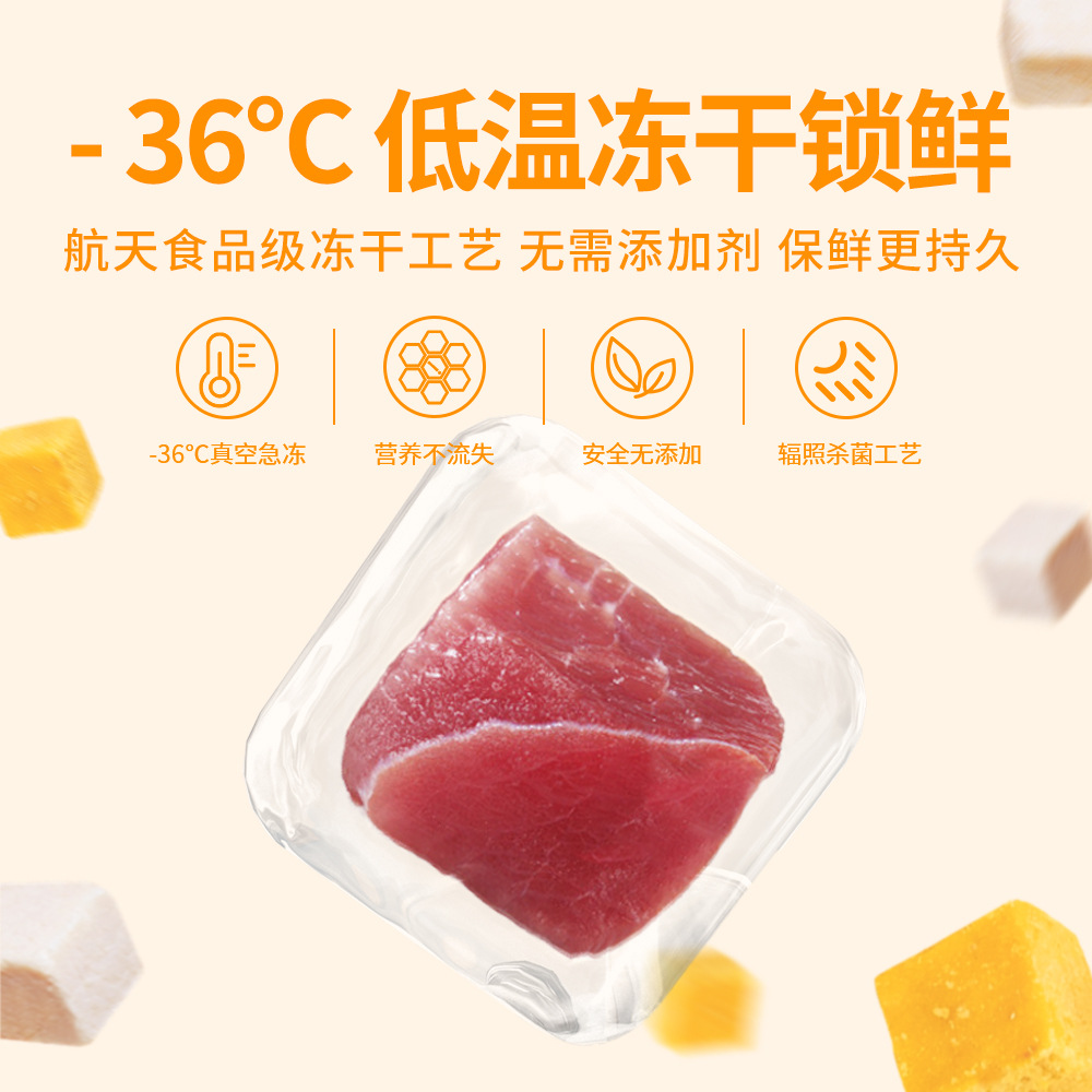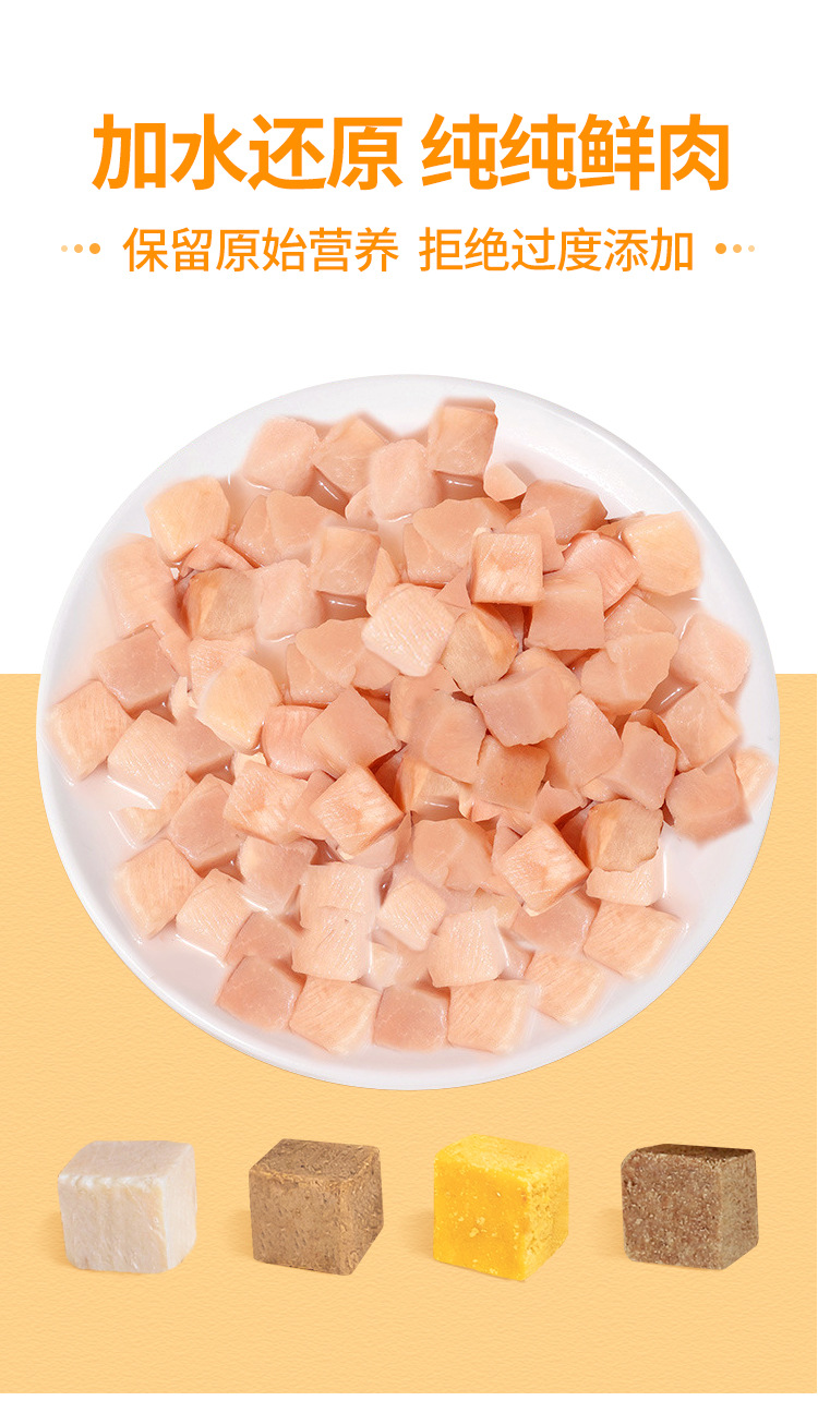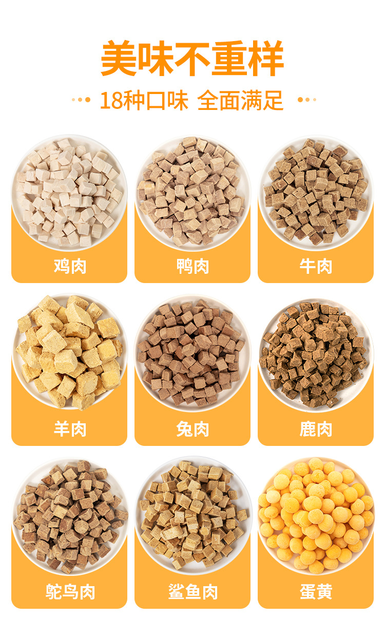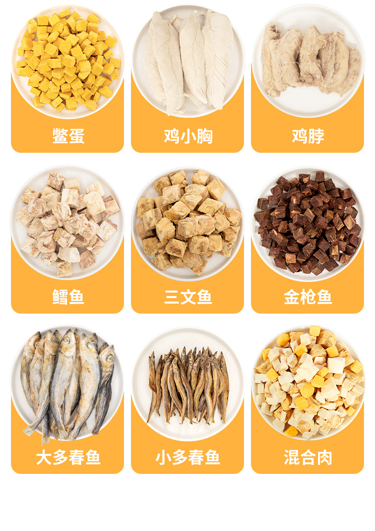 Based on the production records and extensive statistical data analysis of Rizhao Shungong Pet Food Co., Ltd., a real and stable freeze-drying process and process control have been established. It has been found that raw materials including chicken, duck, cod, salmon, beef, rabbit, lamb, egg yolk, and chicken liver, as well as fruits and vegetables, after being subjected to low-temperature freeze-drying, only 20% of the raw materials are converted into finished products. The finished products retain their nutritional components such as protein, fat, ash, and fiber intact, except for the loss of water. Essentially, five times the weight of the raw materials are concentrated into only one times the weight of the finished product through freeze-drying. The nutrients are not lost, and the products are easy to store and preserve. Therefore, the products in this shop claim a 5:1 concentration of ingredients, and the concentration in this shop only refers to the weight concentration of ingredients and nutrition.