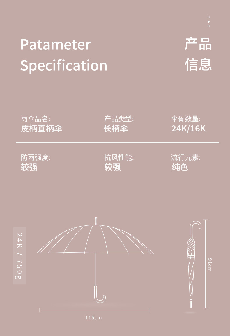 [24-rib manual] coffee-colored bent-handle umbrella