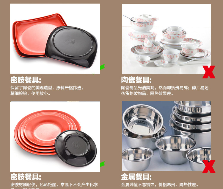 Material: 100% Melamine, Enamel, Suitable for: Western and Chinese restaurants, hotels, restaurants, buffet hotpot, barbecue shops, and food and beverage industries.