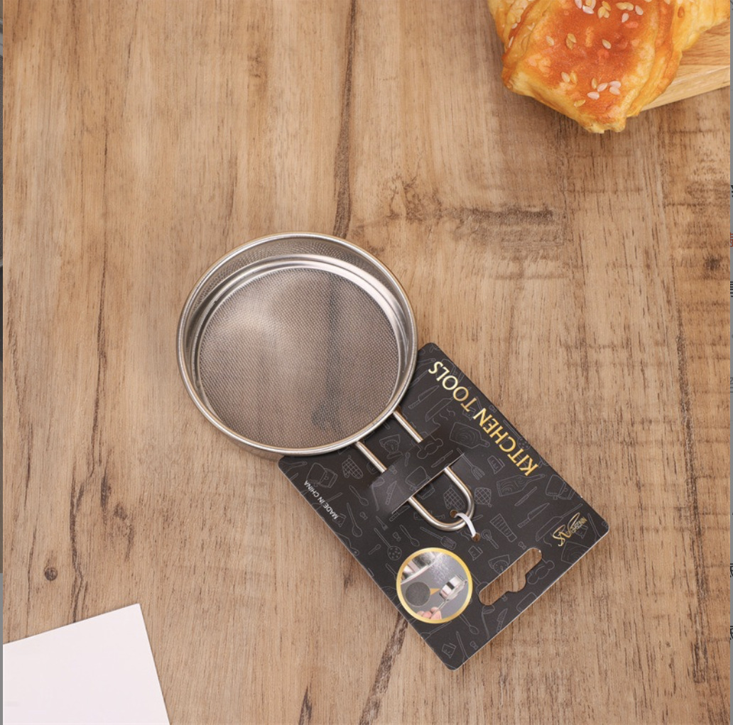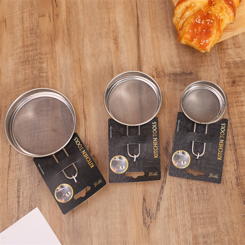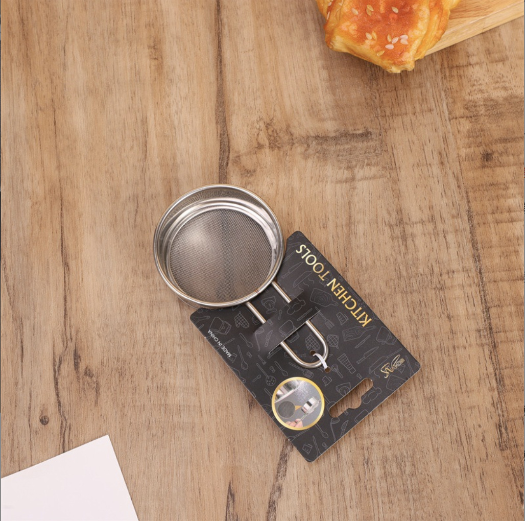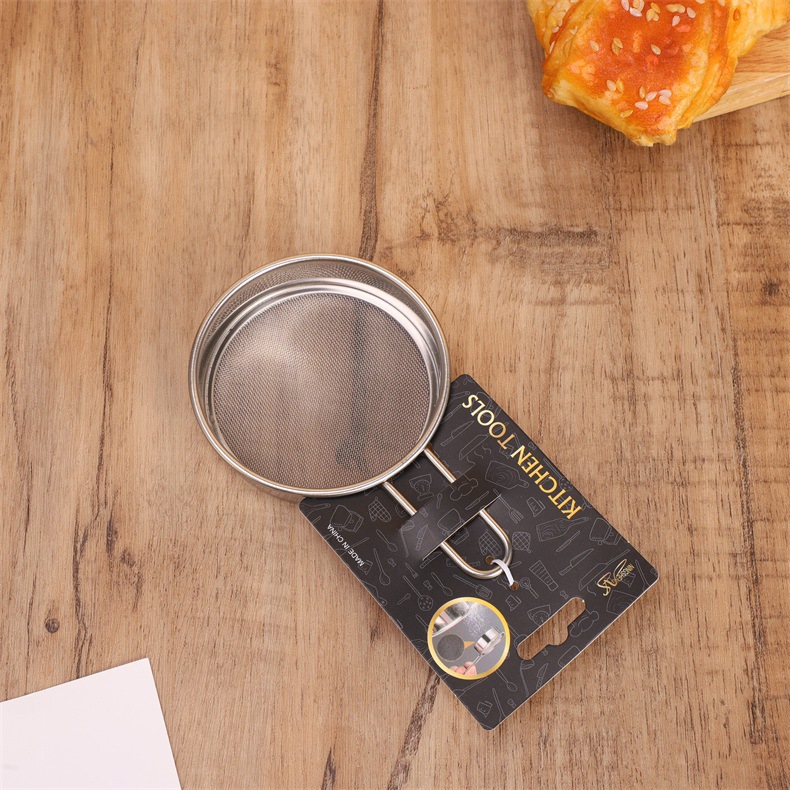 specifications: 11cm steel handle flat bottom powder sieve, 9cm steel handle flat bottom powder sieve