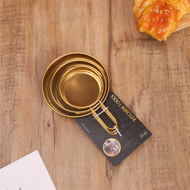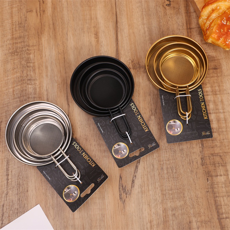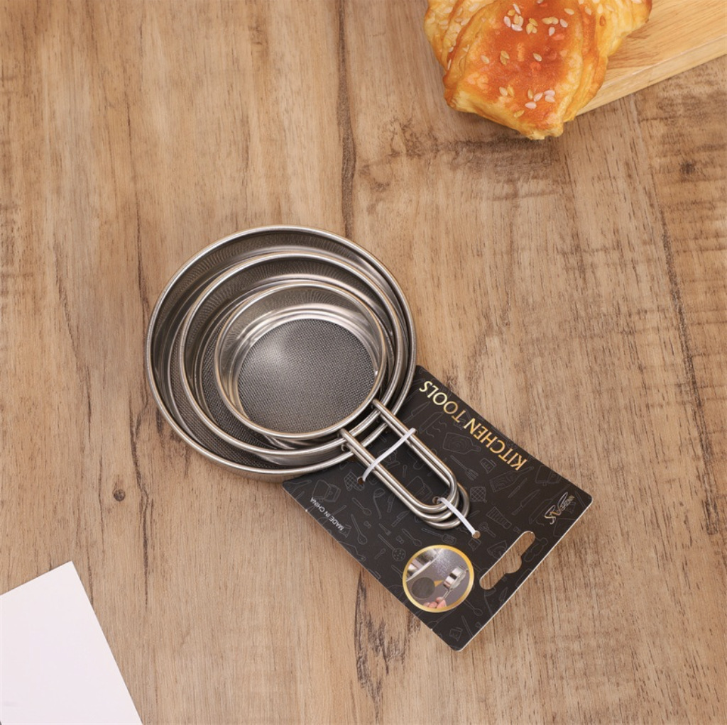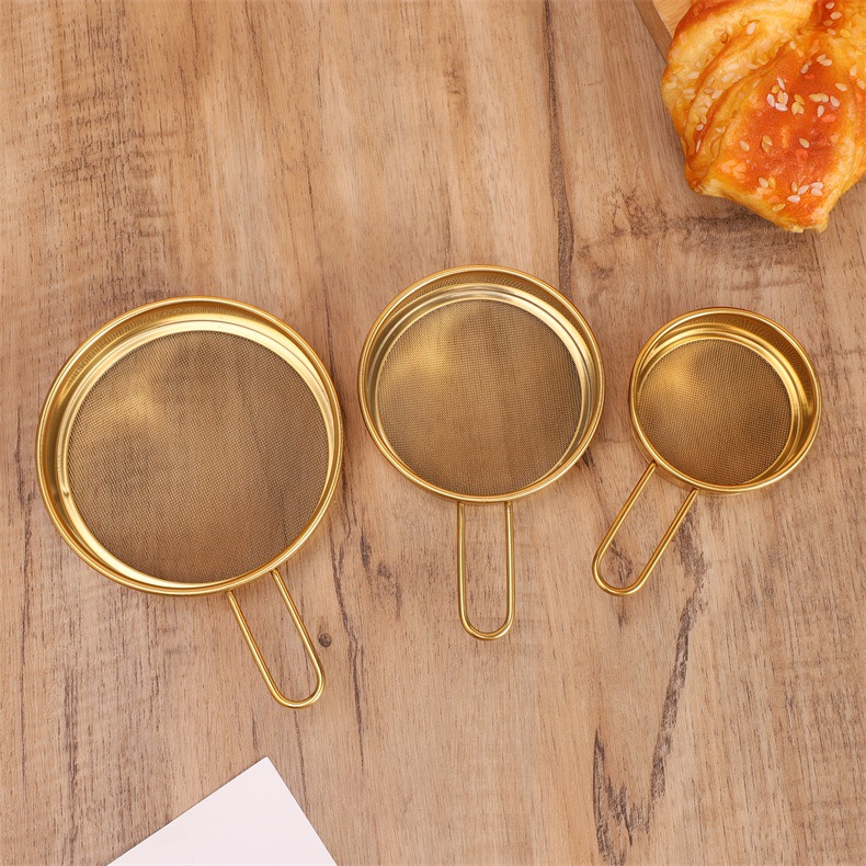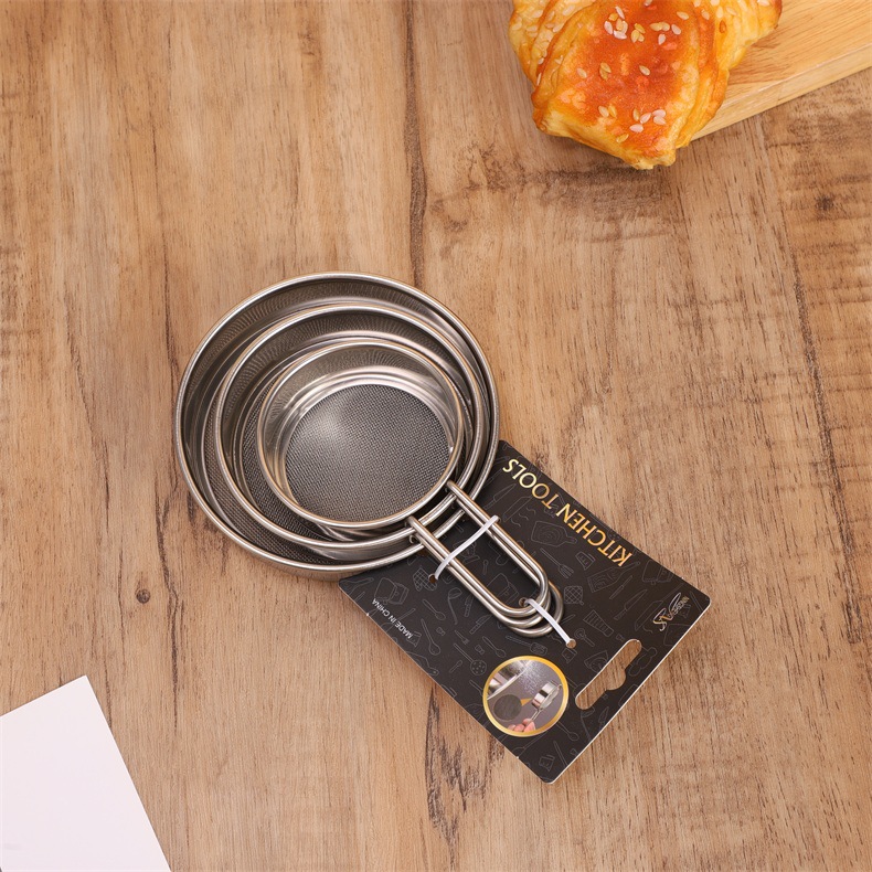 specifications: 11cm steel handle flat bottom powder sieve, 9cm steel handle flat bottom powder sieve